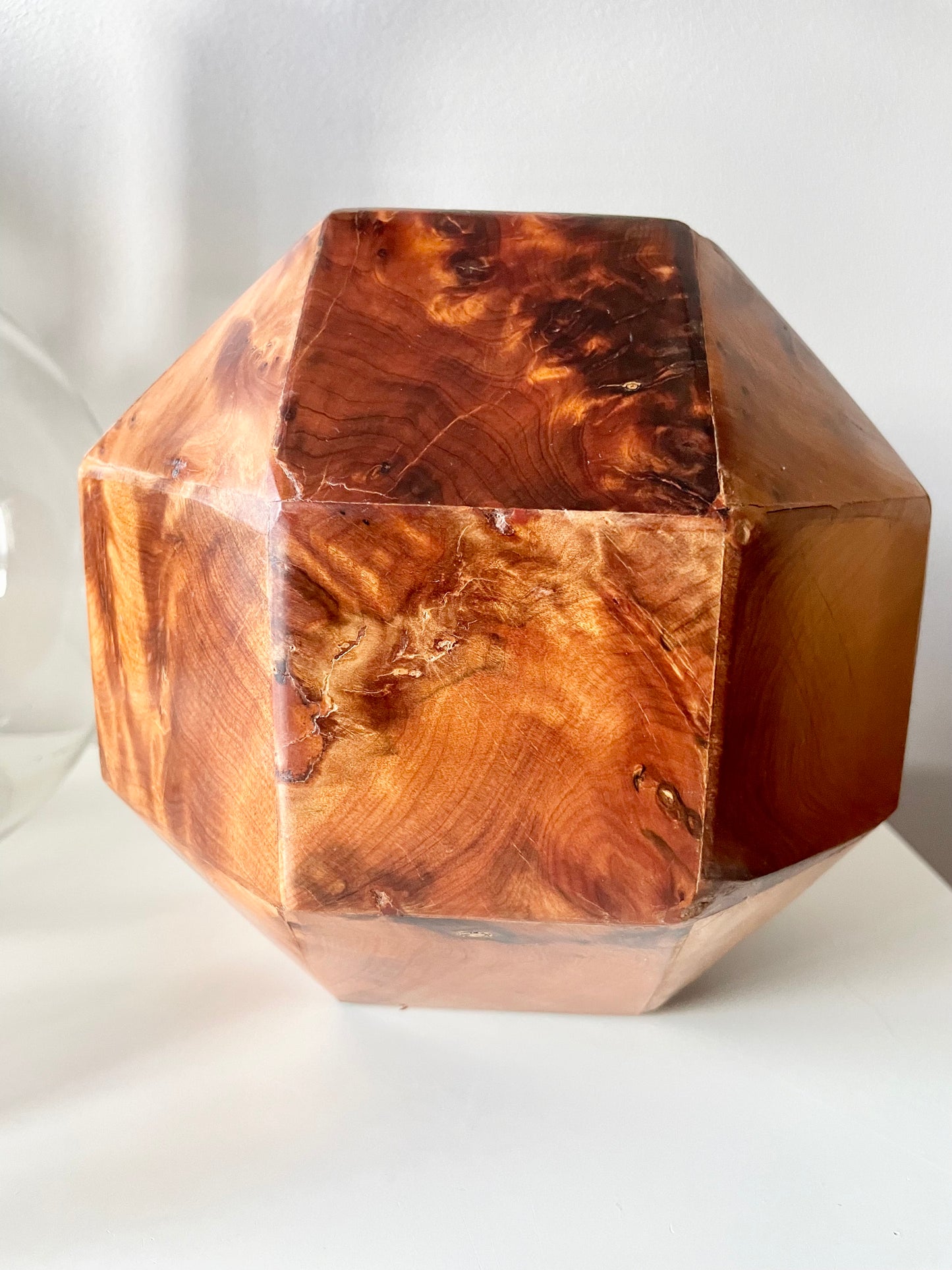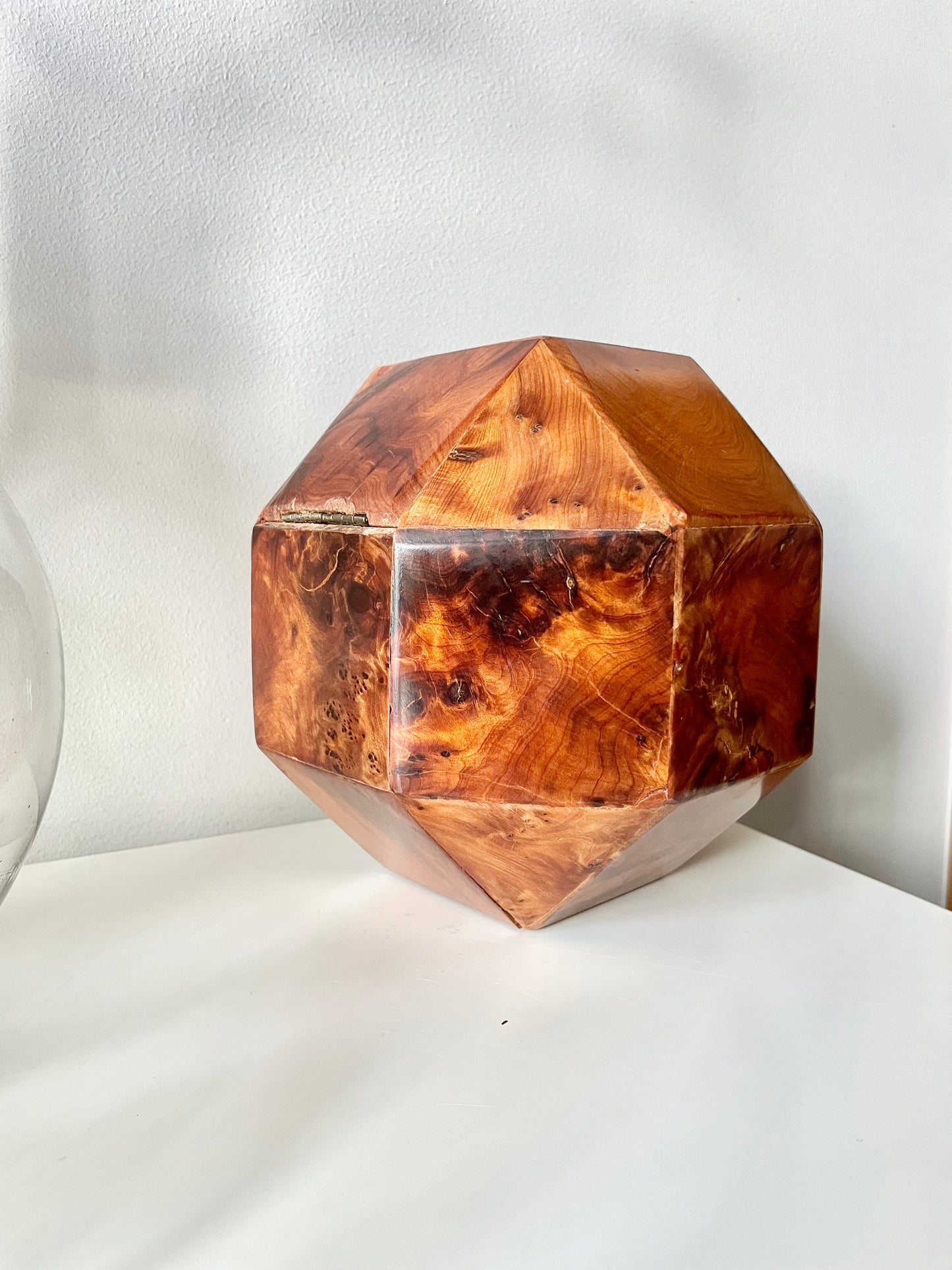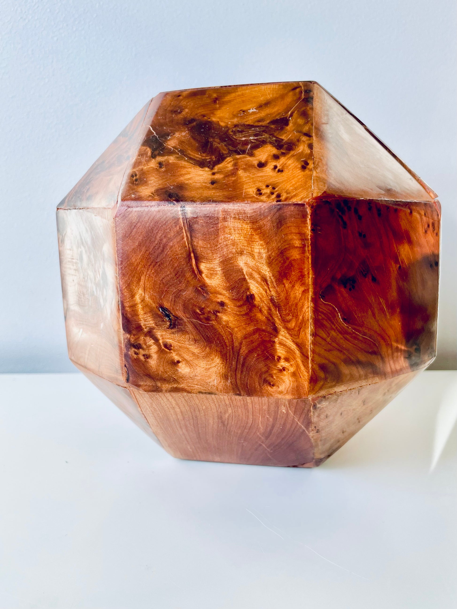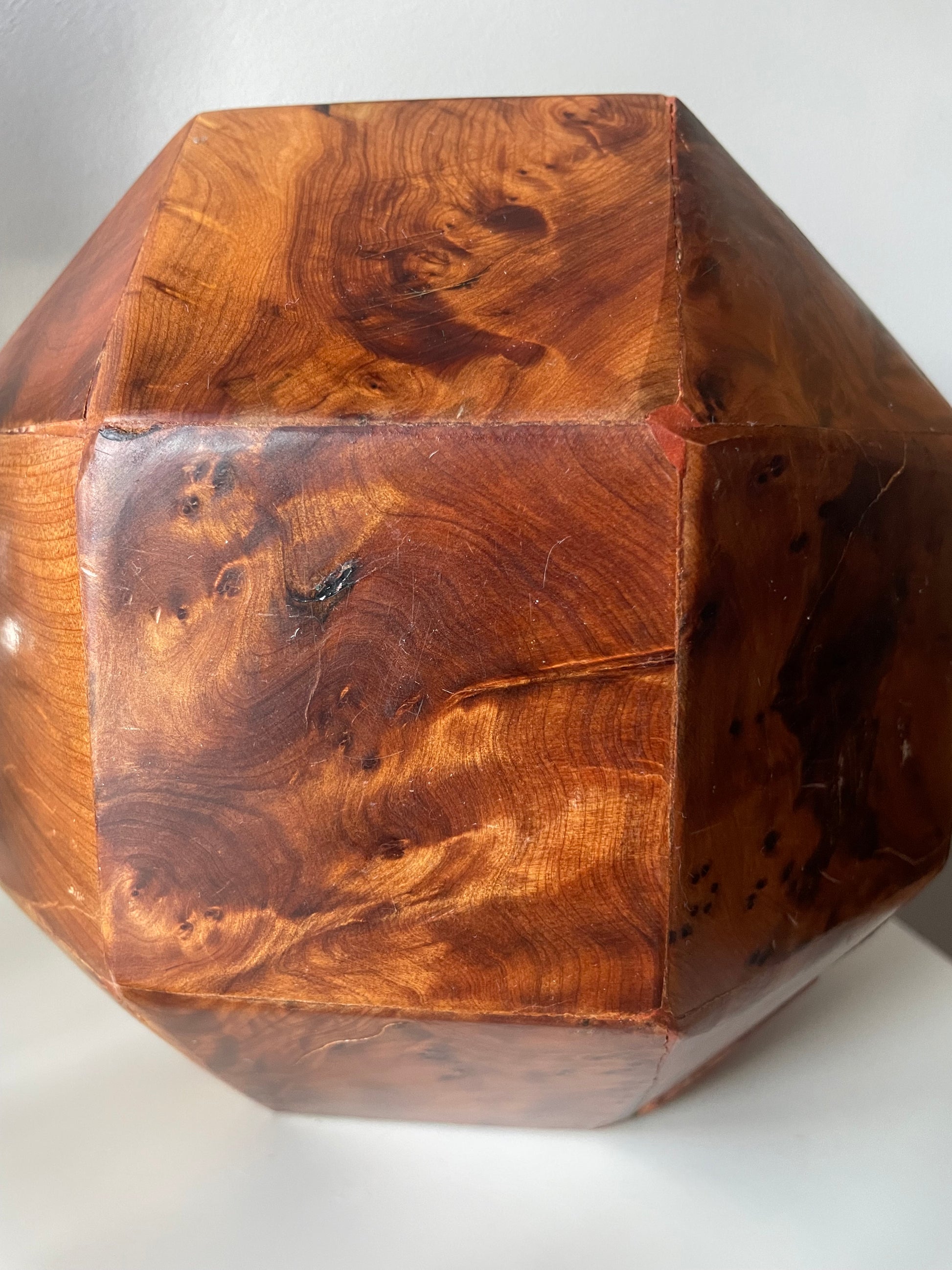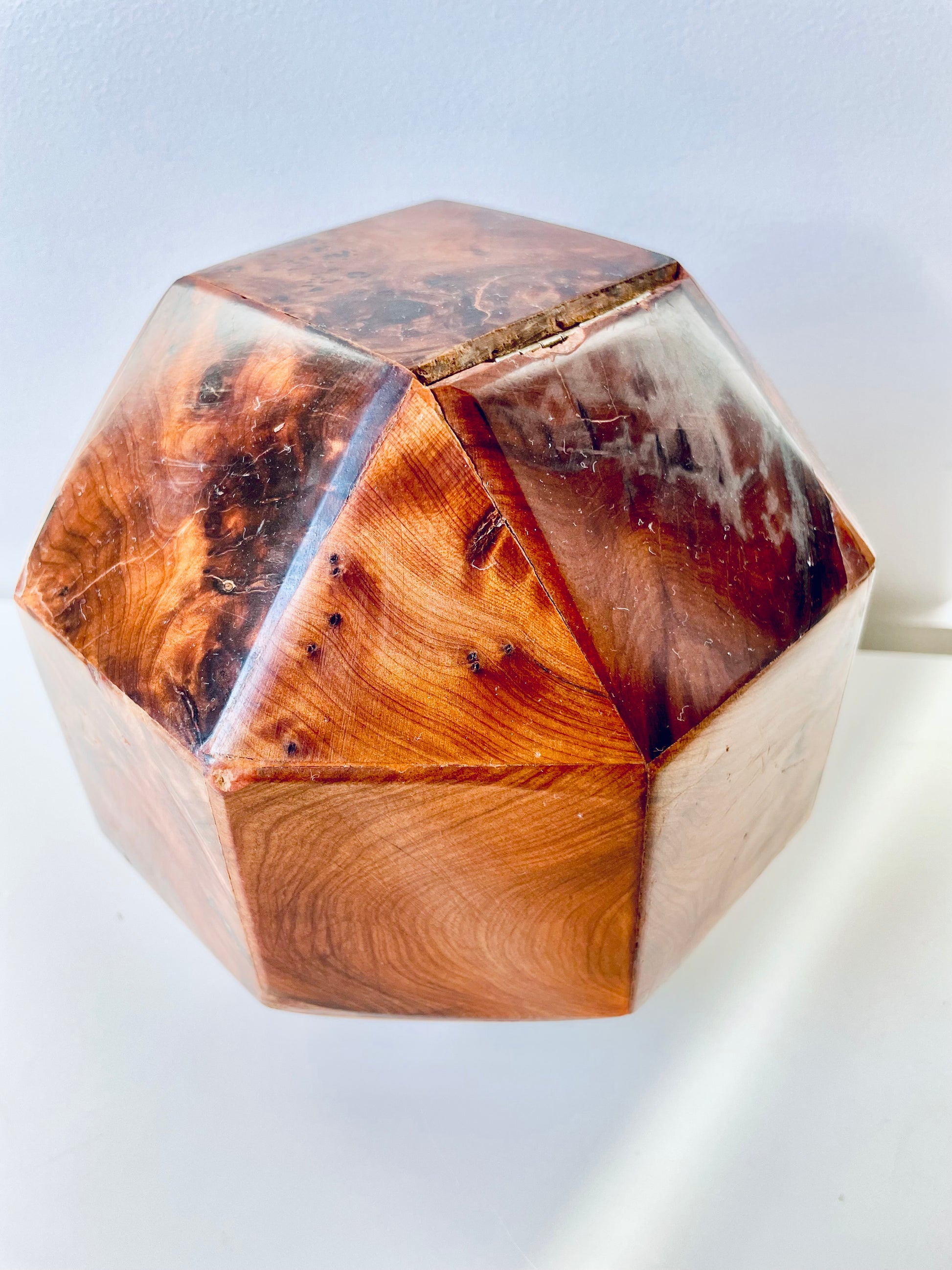 All twenty-six sides of this box are made of beautifully grained burl wood, it has the rich honey&whiskey colour, wonderful grain and patina of old wood. The top section is hinged and lifts to reveal a hollow interior - this sculptural object is a perfect secret hiding place.
