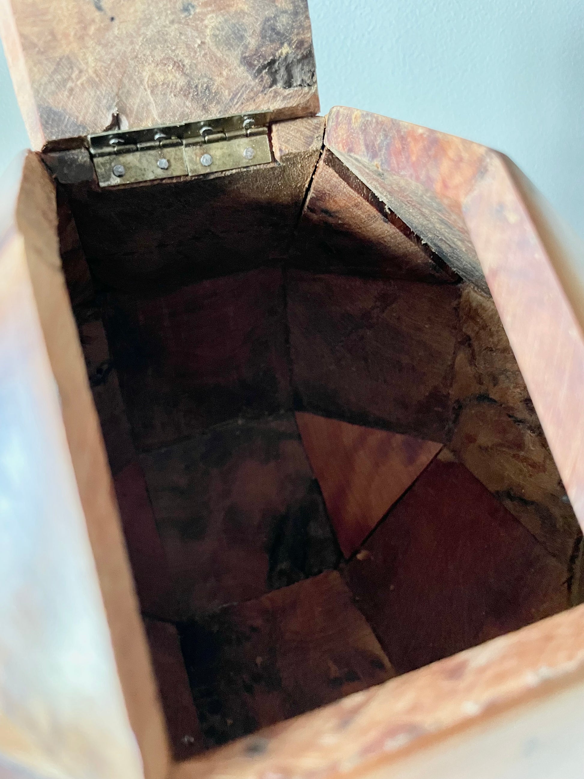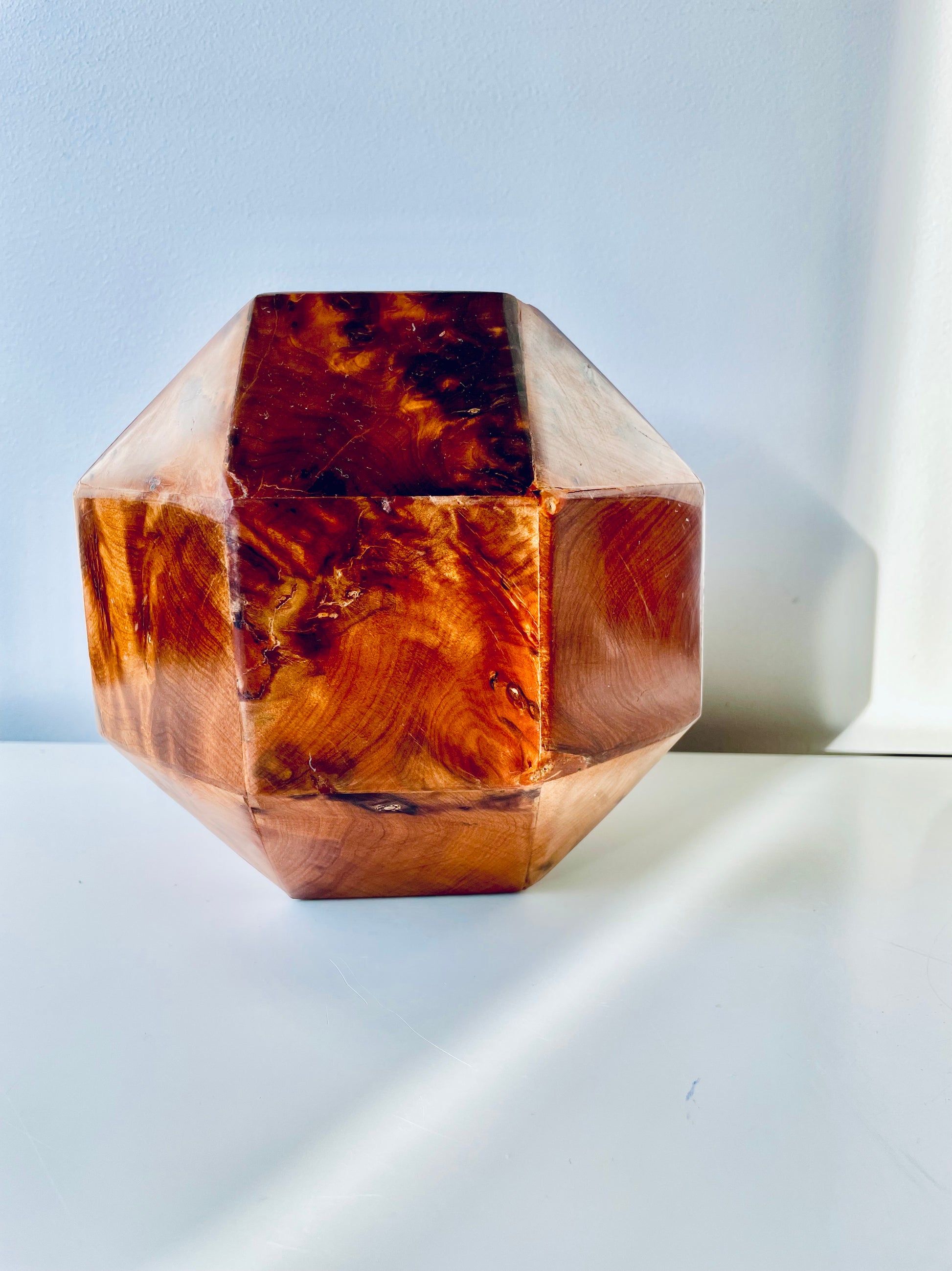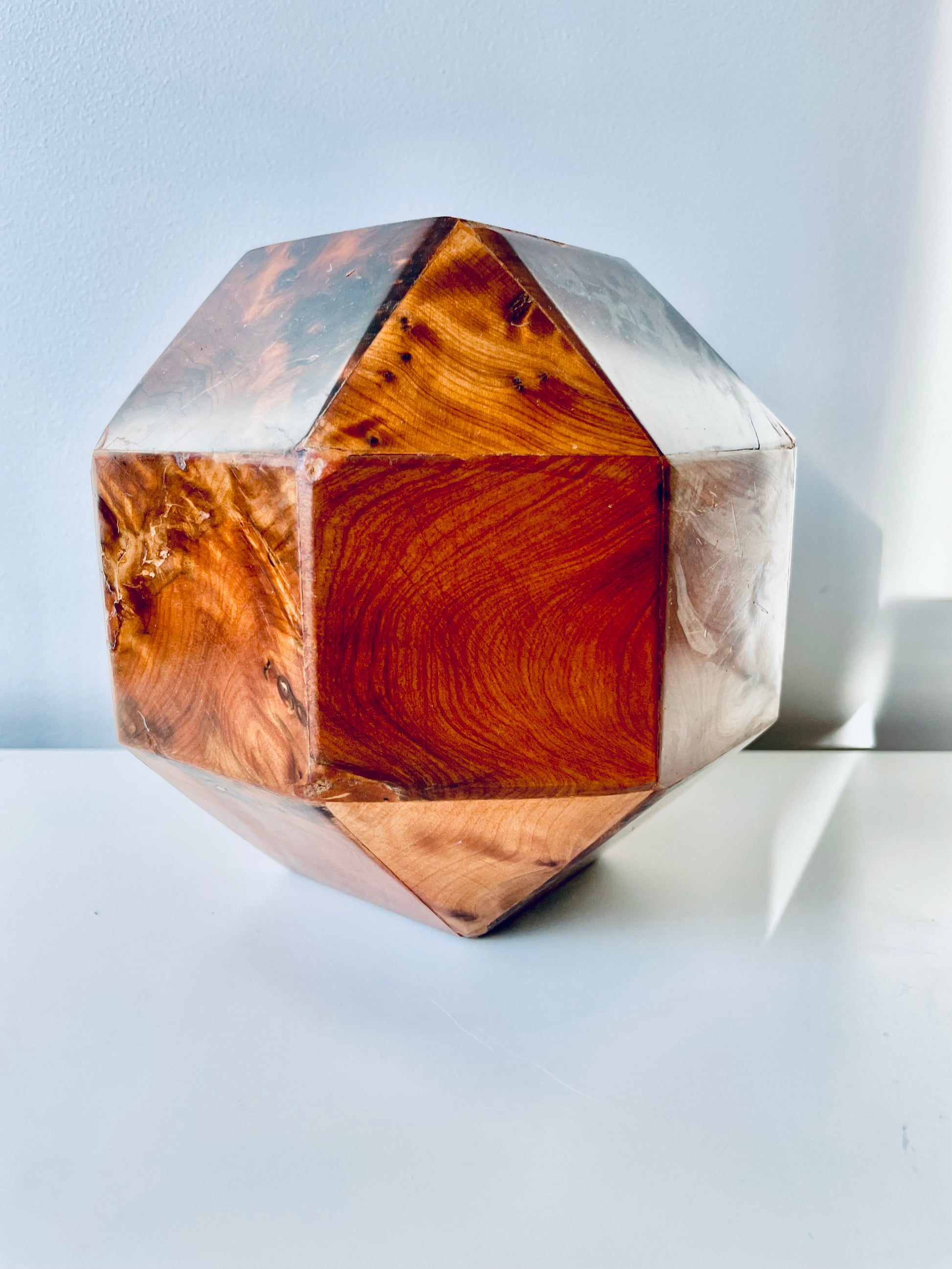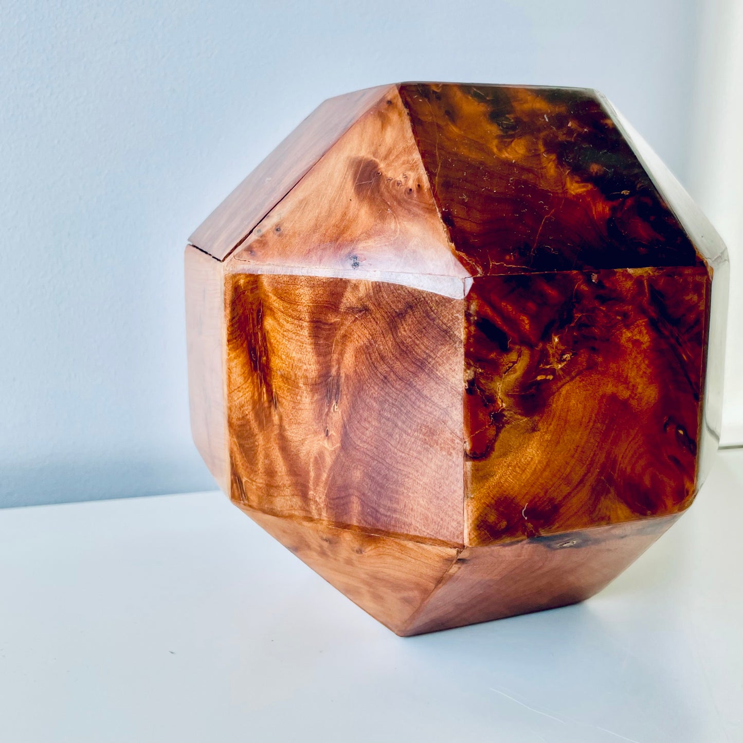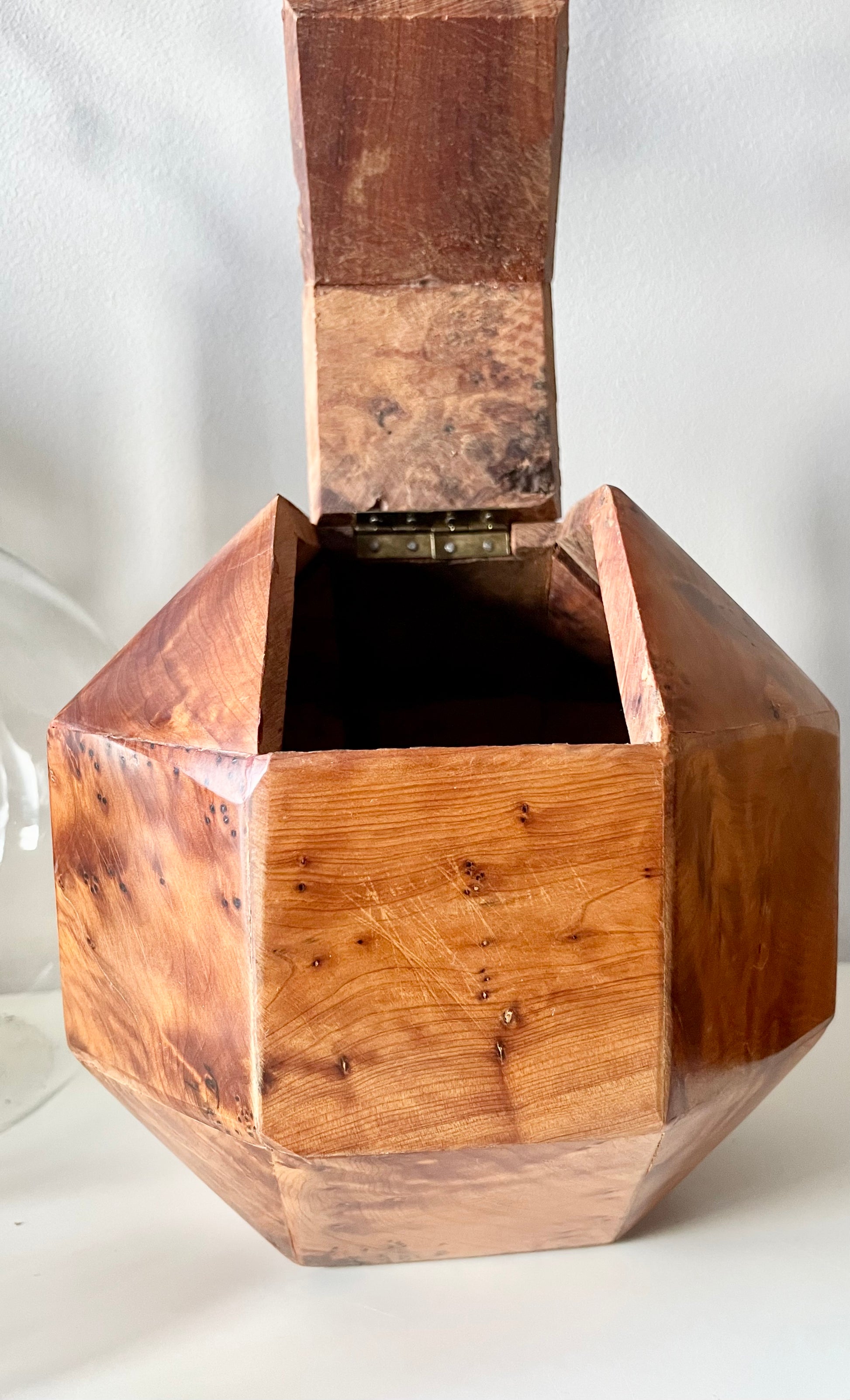 All twenty-six sides of this box are made of beautifully grained burl wood, it has the rich honey&whiskey colour, wonderful grain and patina of old wood. The top section is hinged and lifts to reveal a hollow interior - this sculptural object is a perfect secret hiding place.