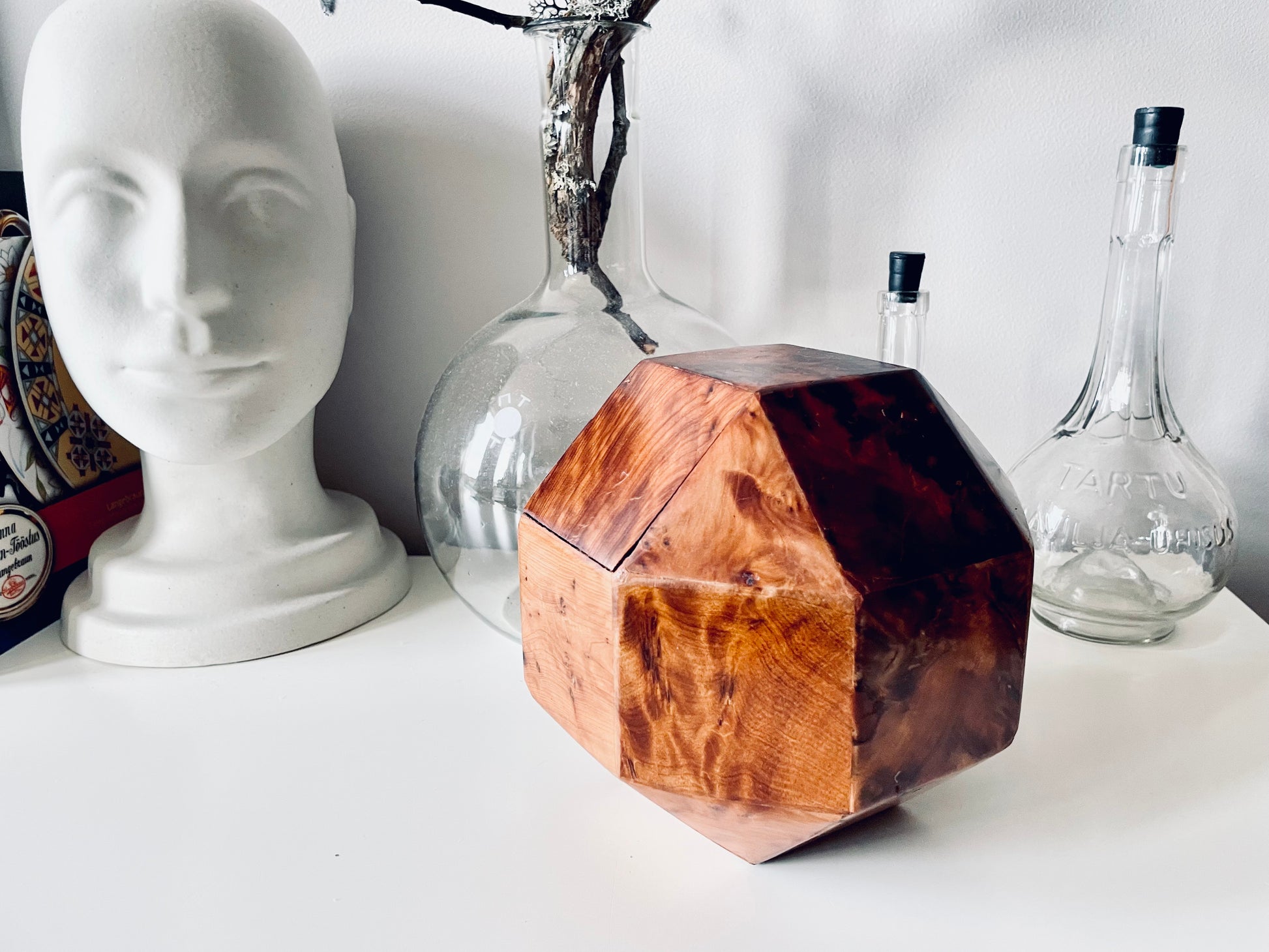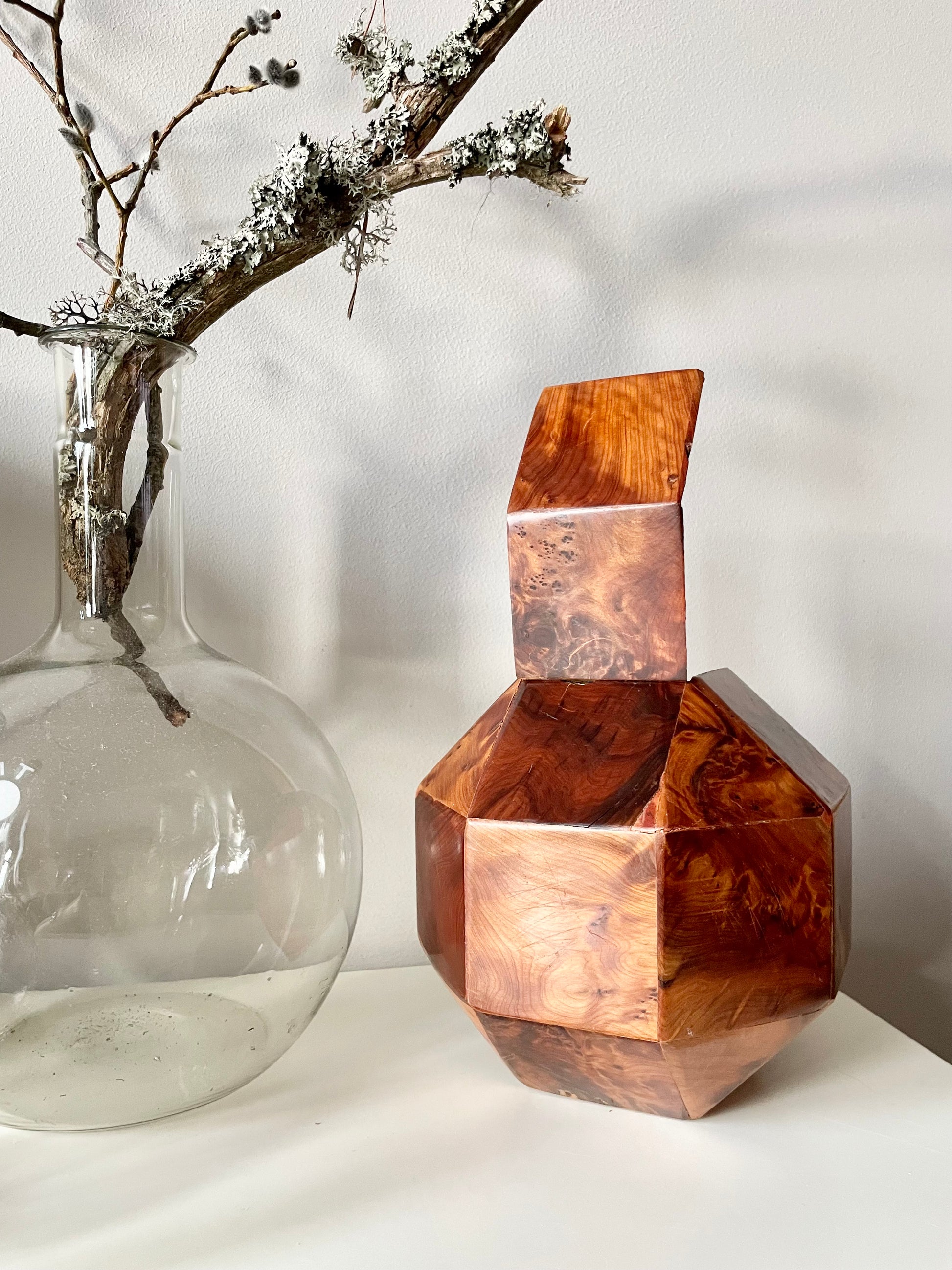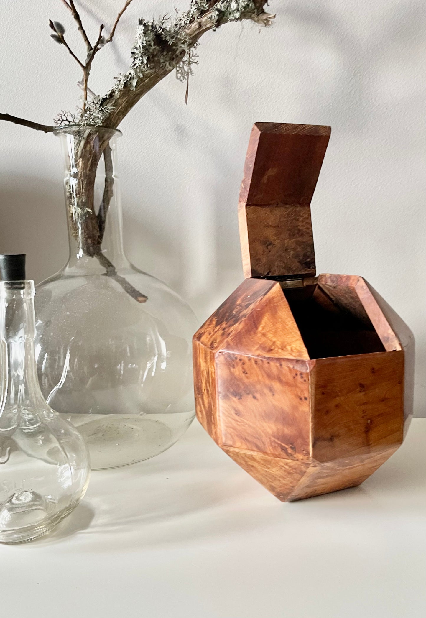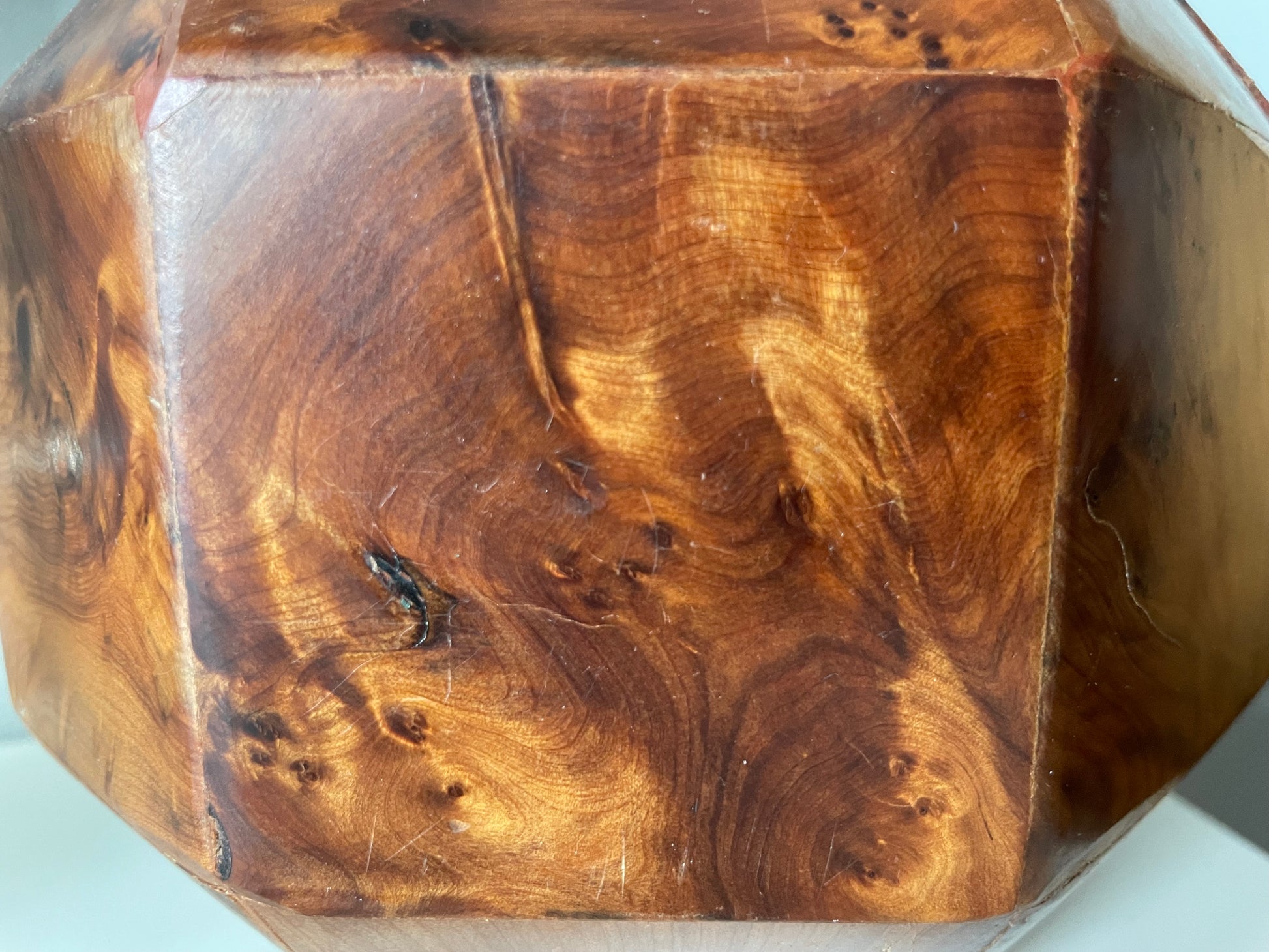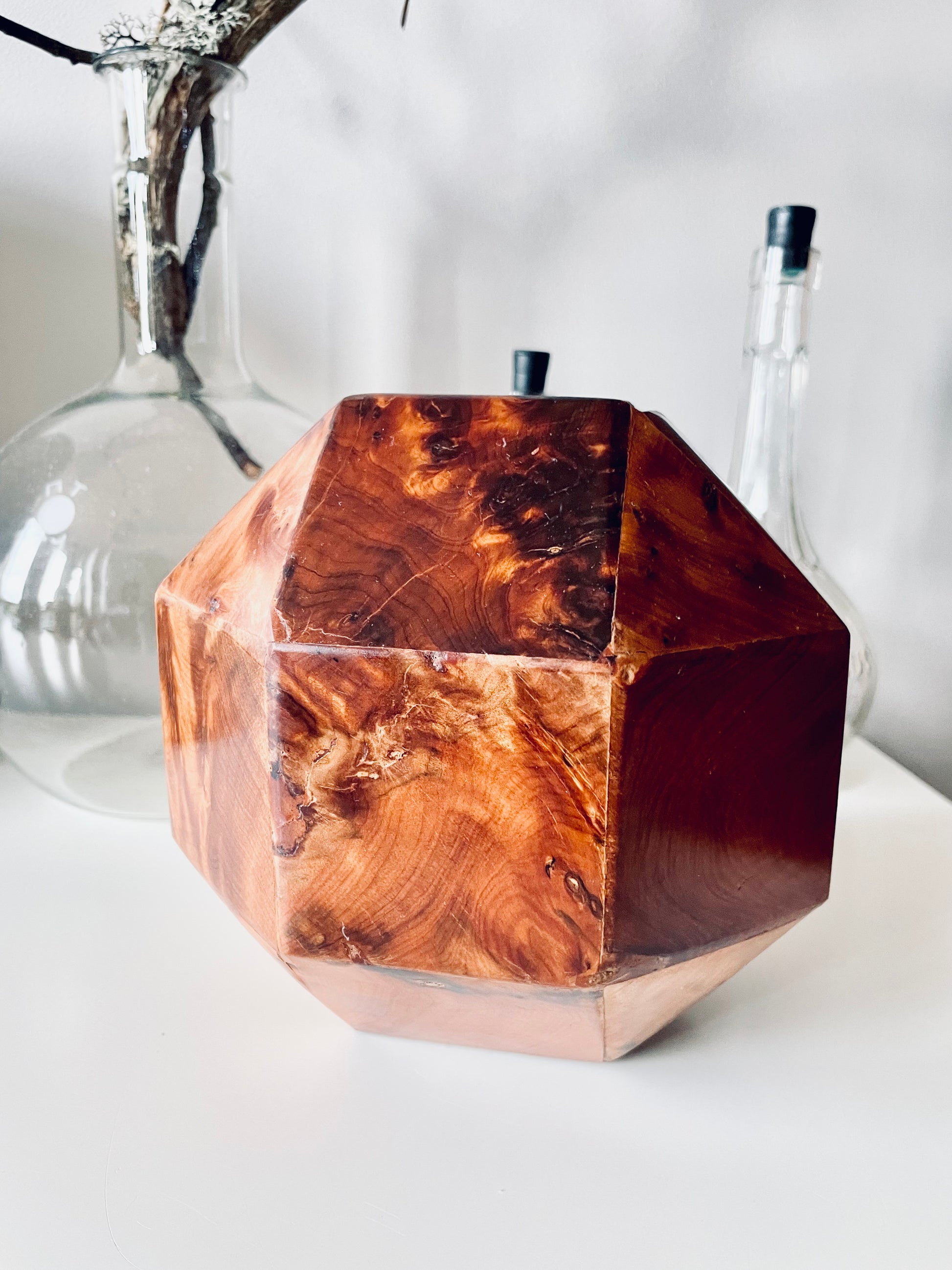 All twenty-six sides of this box are made of beautifully grained burl wood, it has the rich honey&whiskey colour, wonderful grain and patina of old wood. The top section is hinged and lifts to reveal a hollow interior - this sculptural object is a perfect secret hiding place.
