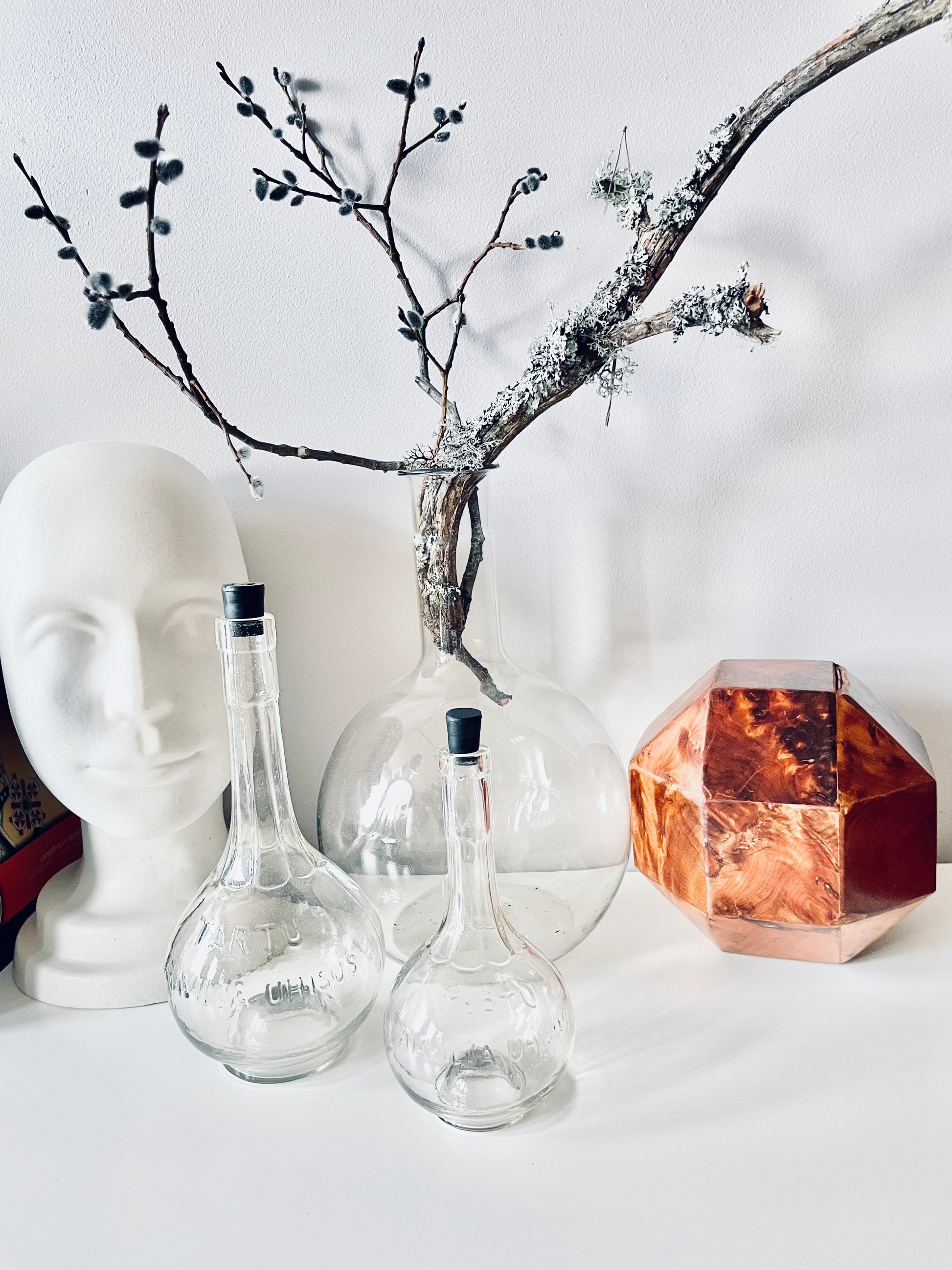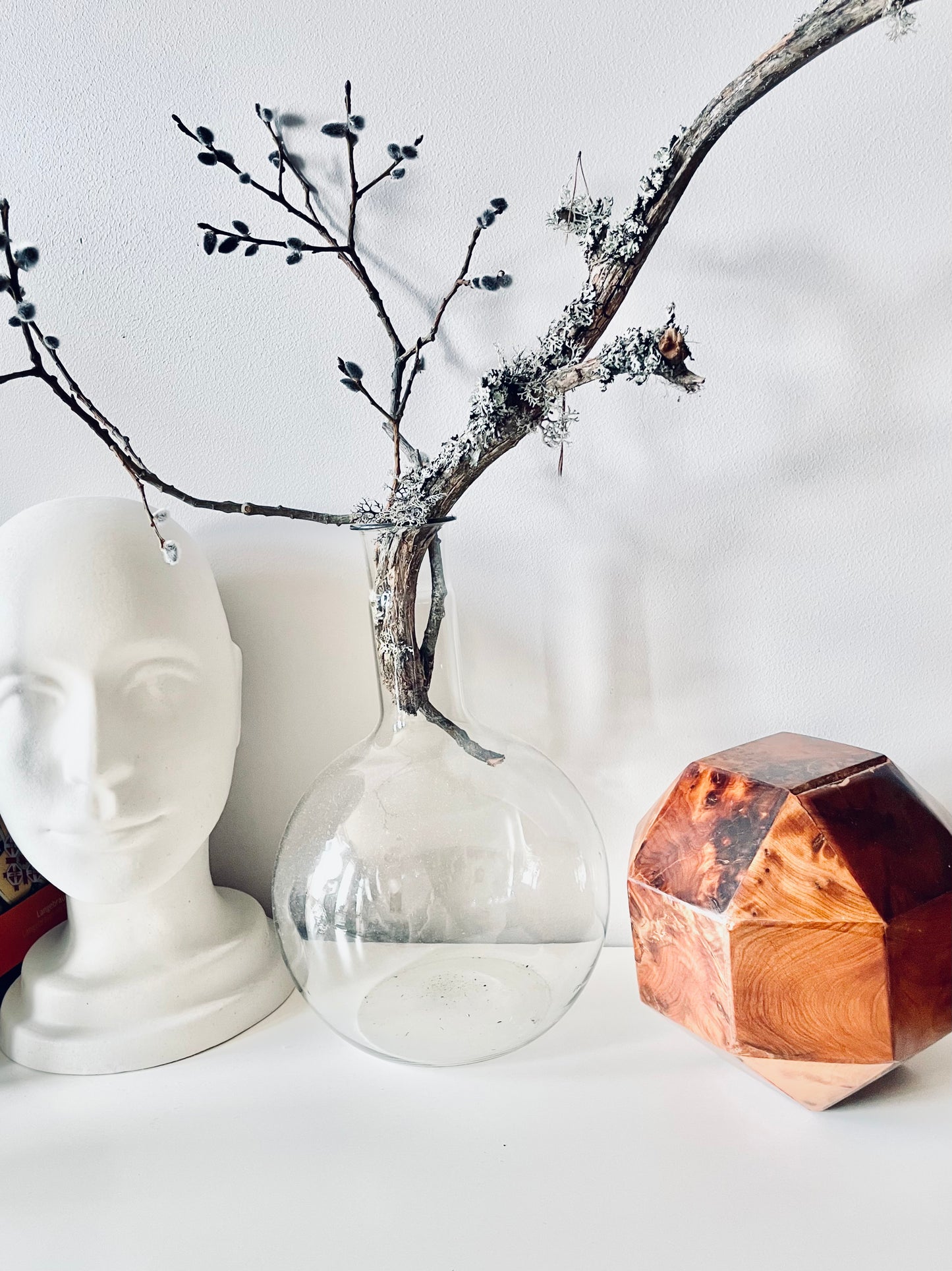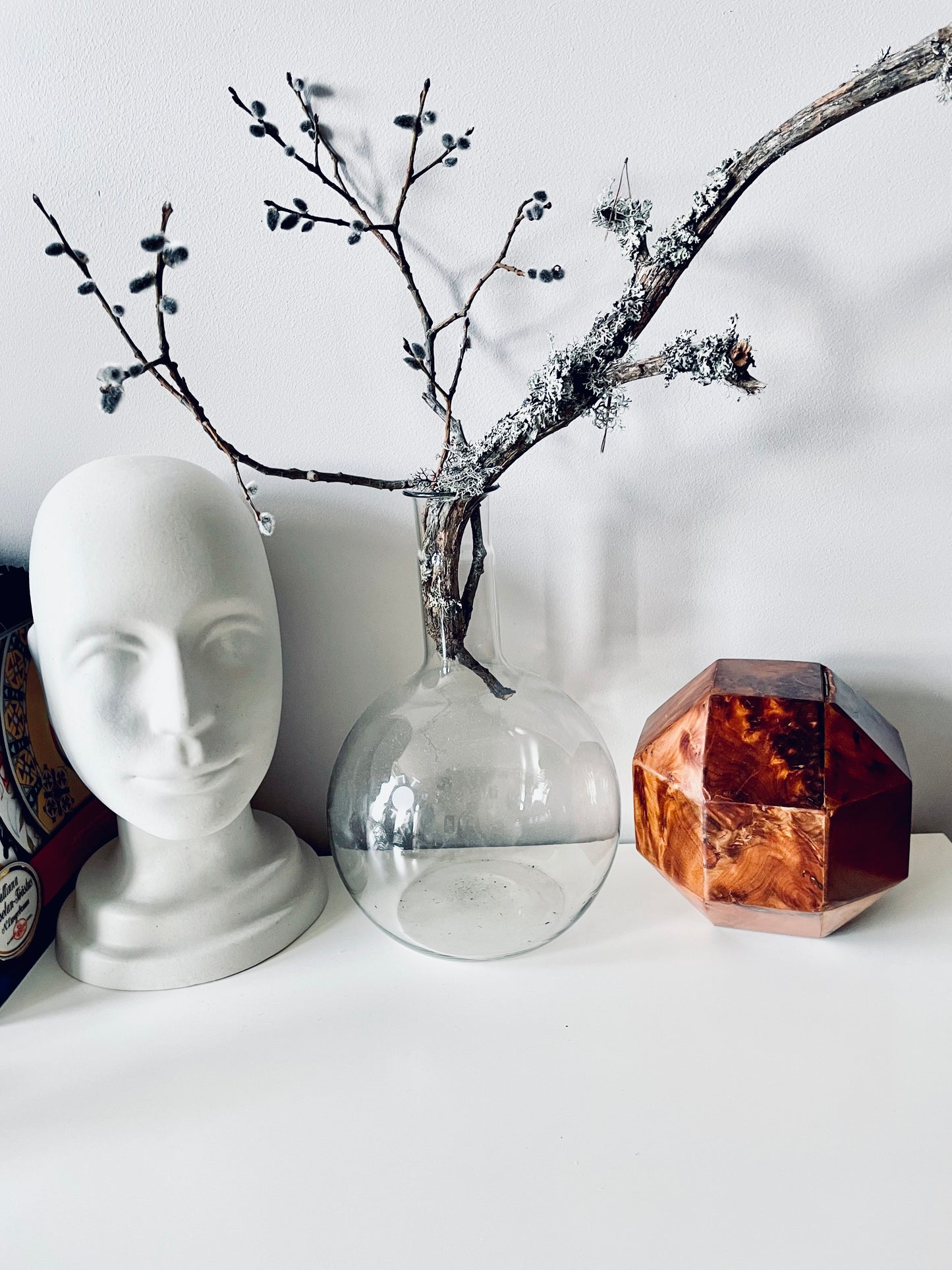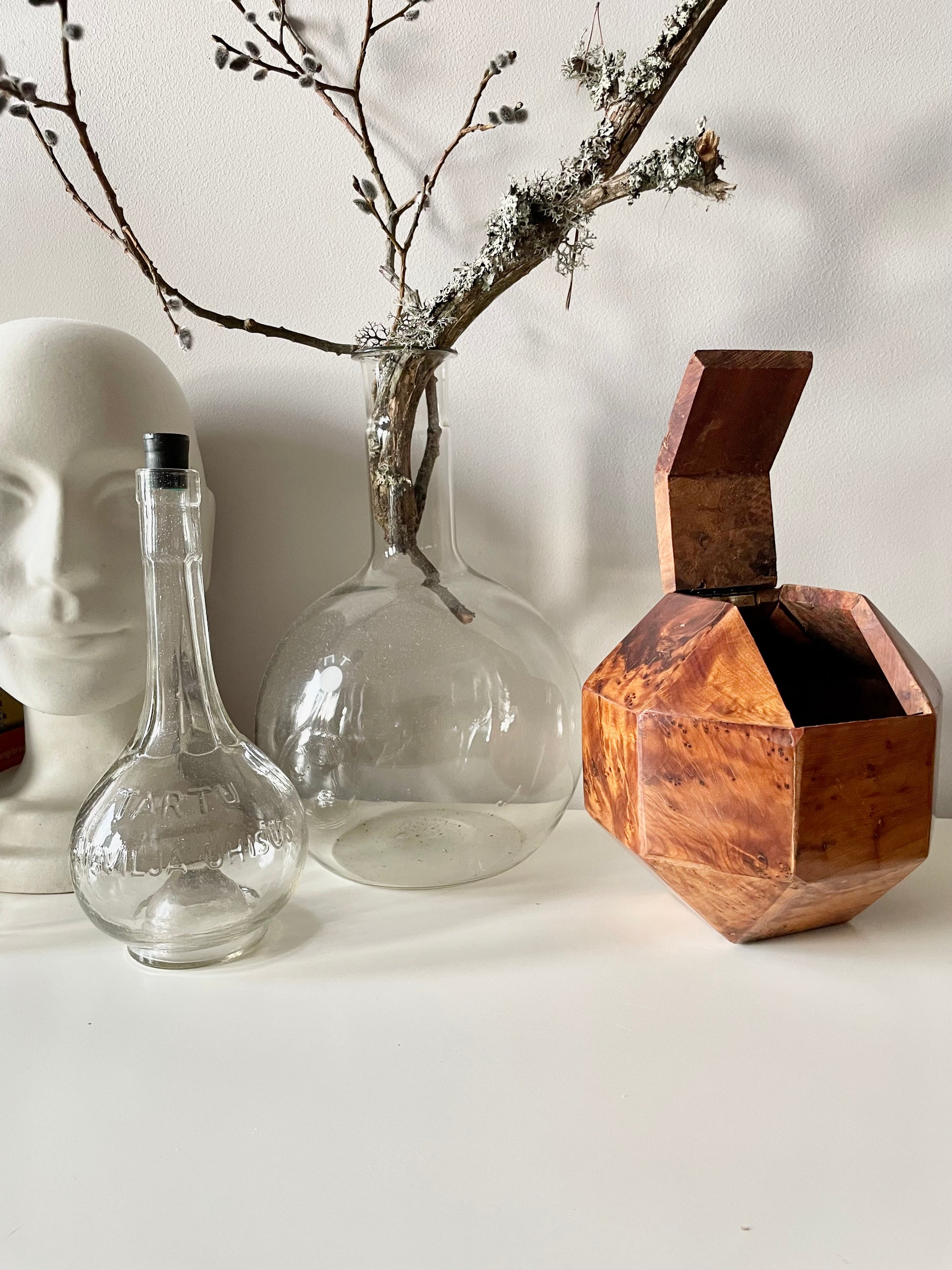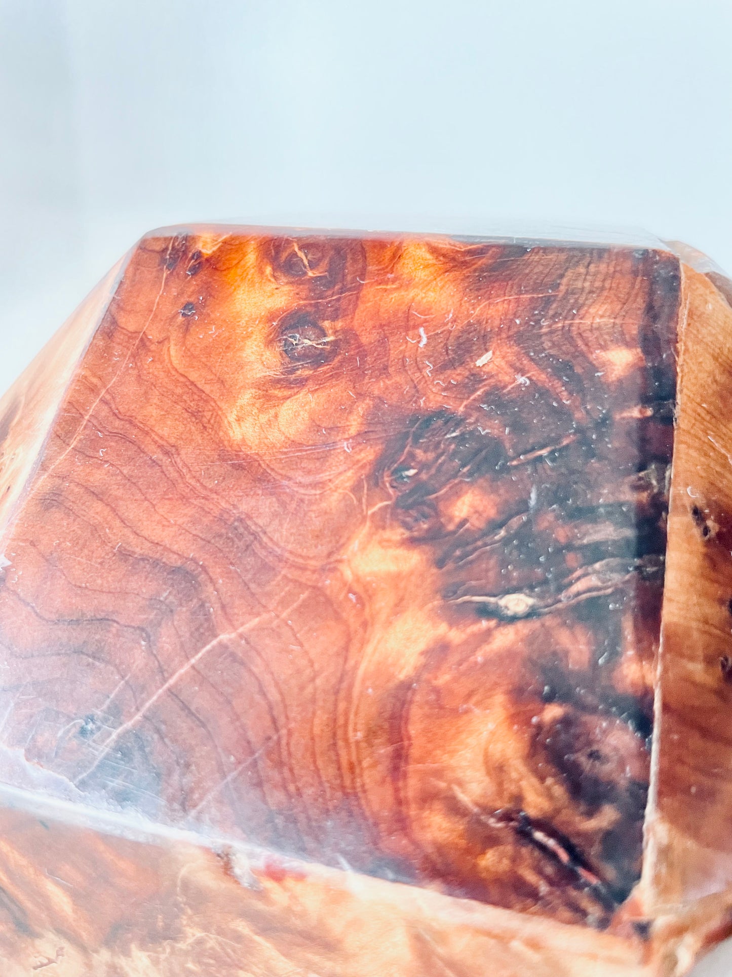 All twenty-six sides of this box are made of beautifully grained burl wood, it has the rich honey&whiskey colour, wonderful grain and patina of old wood. The top section is hinged and lifts to reveal a hollow interior - this sculptural object is a perfect secret hiding place.