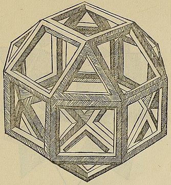 The rhombicuboctahedron may also appear in the art. An example is the 1495 Portrait of Luca Pacioli, traditionally attributed to Jacopo de' Barbari, which includes a glass rhombicuboctahedron half-filled with water, which may have been painted by Leonardo da Vinci.[23]The first printed version of the rhombicuboctahedron was by Leonardo and appeared in Pacioli's Divina proportione (1509).