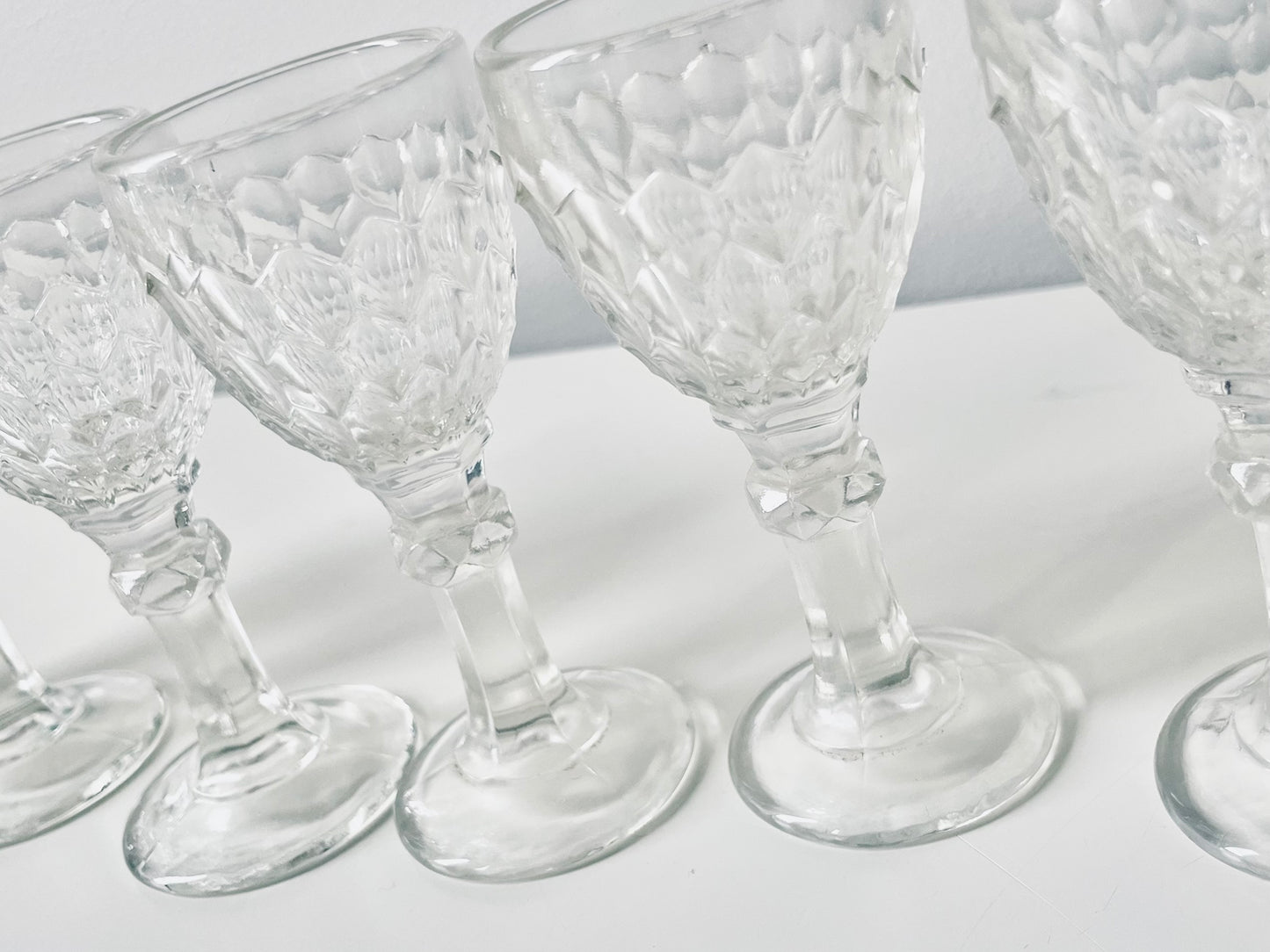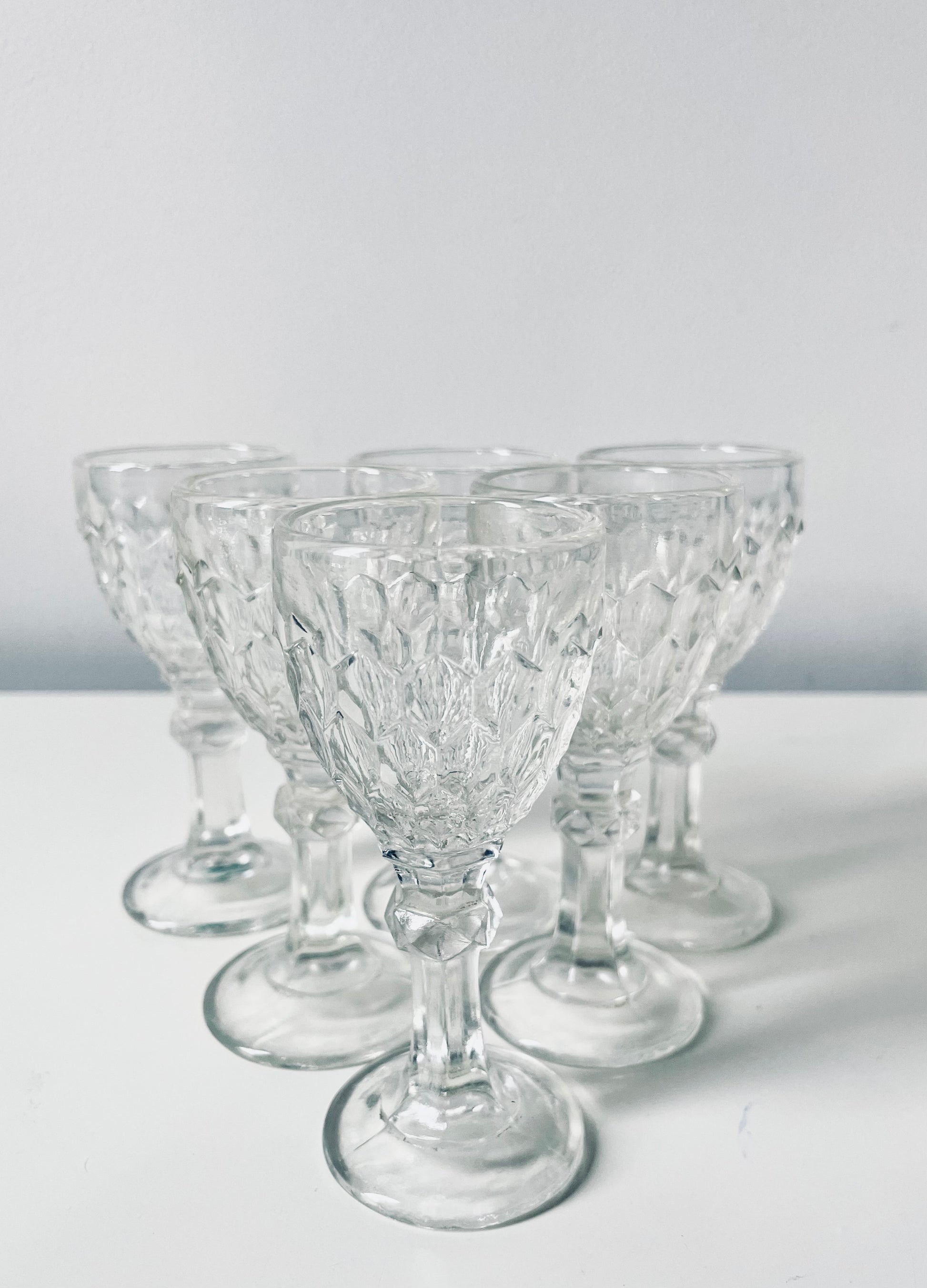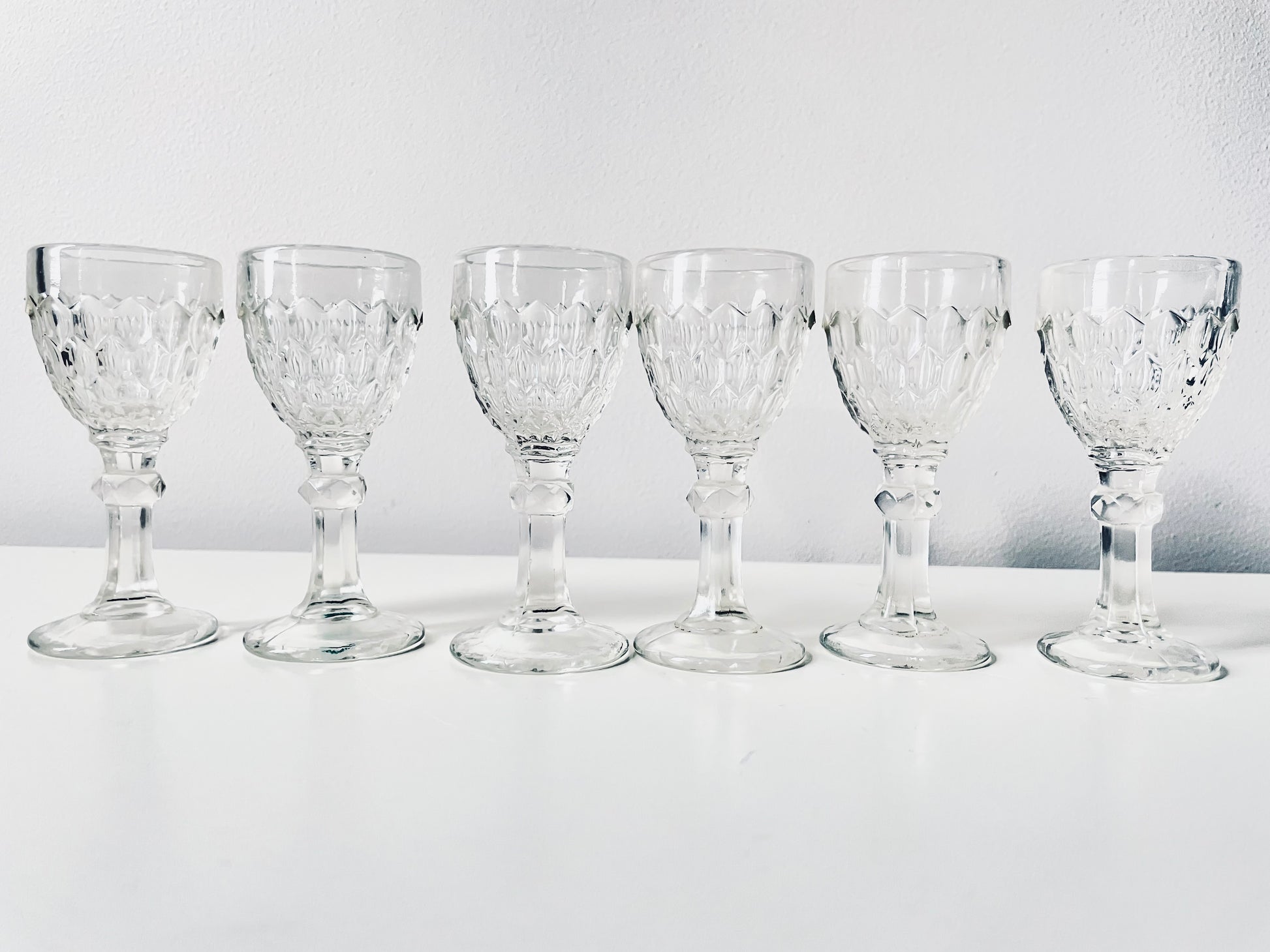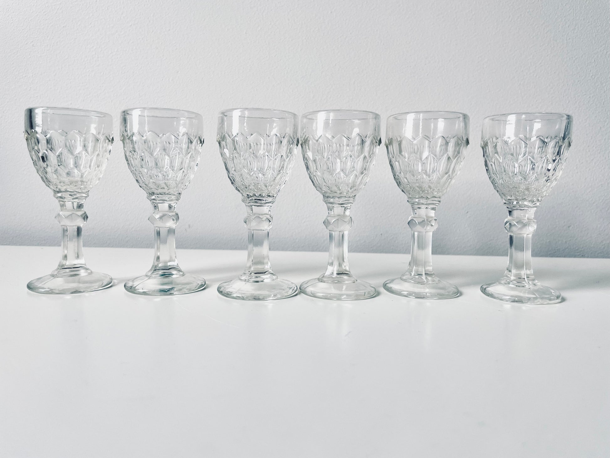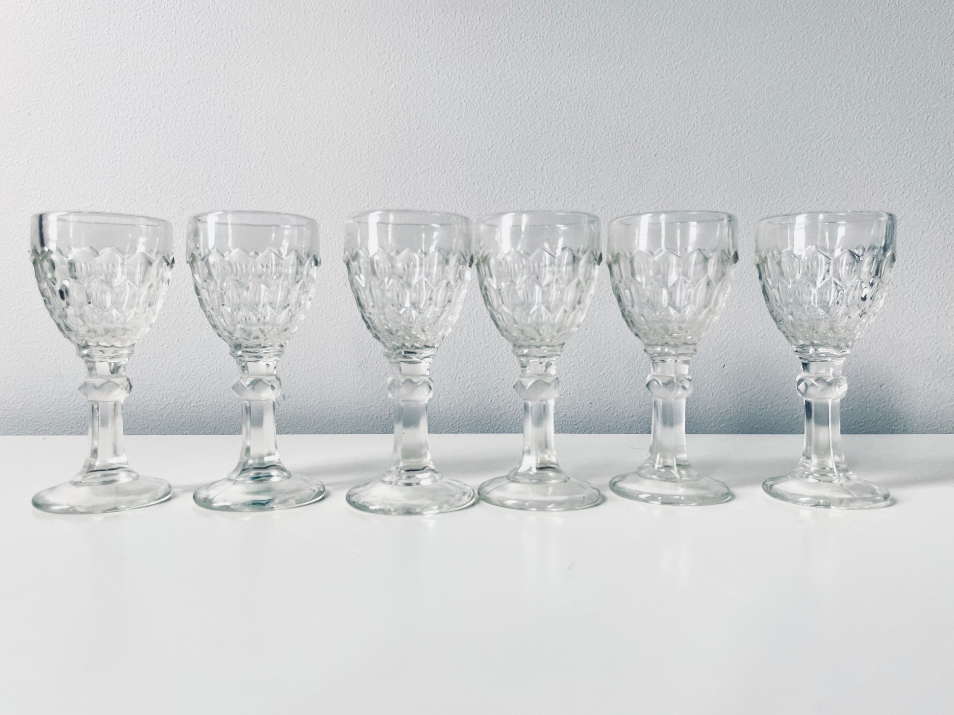 6 Lorup pressed glass liquor glasses.