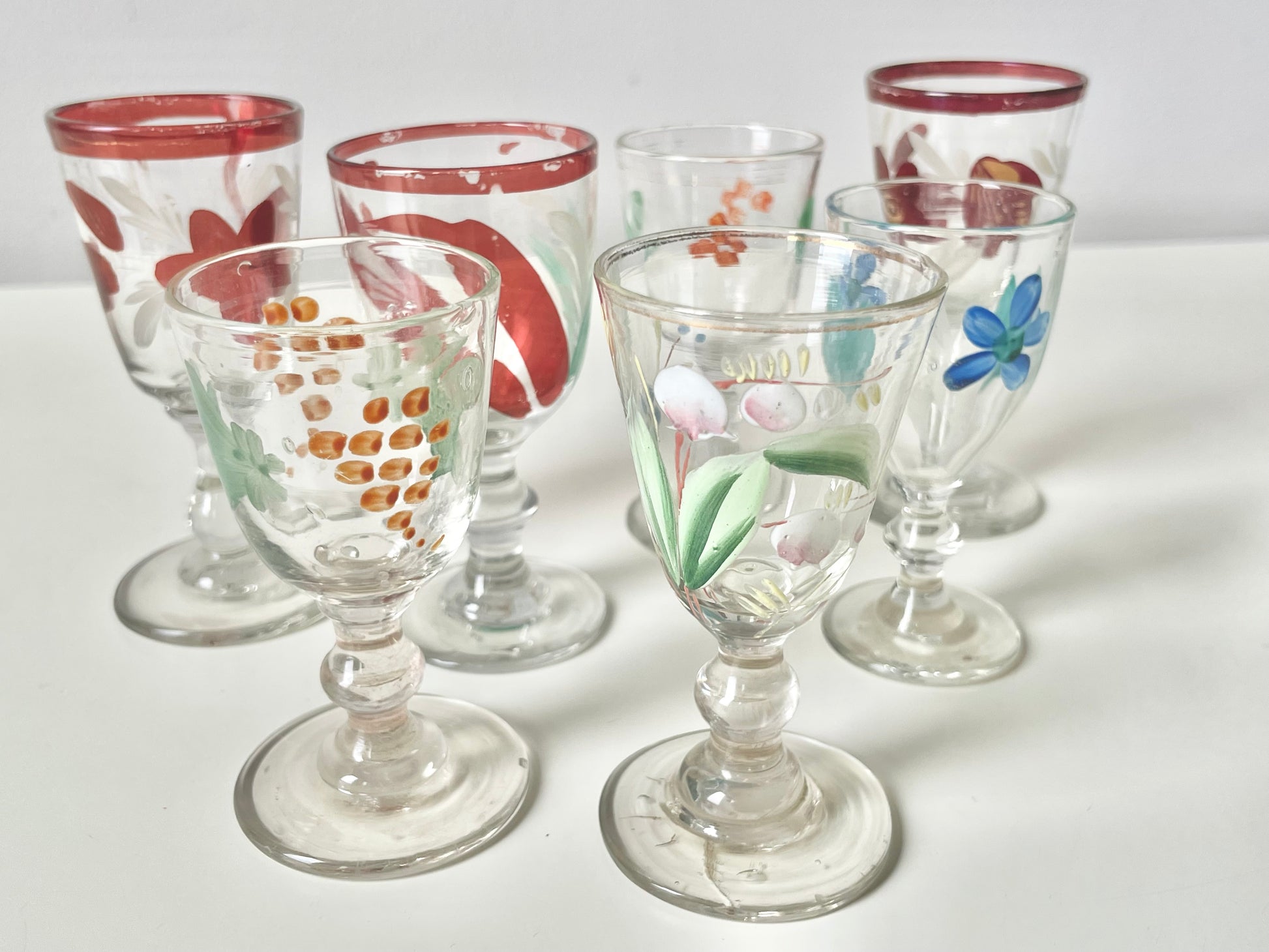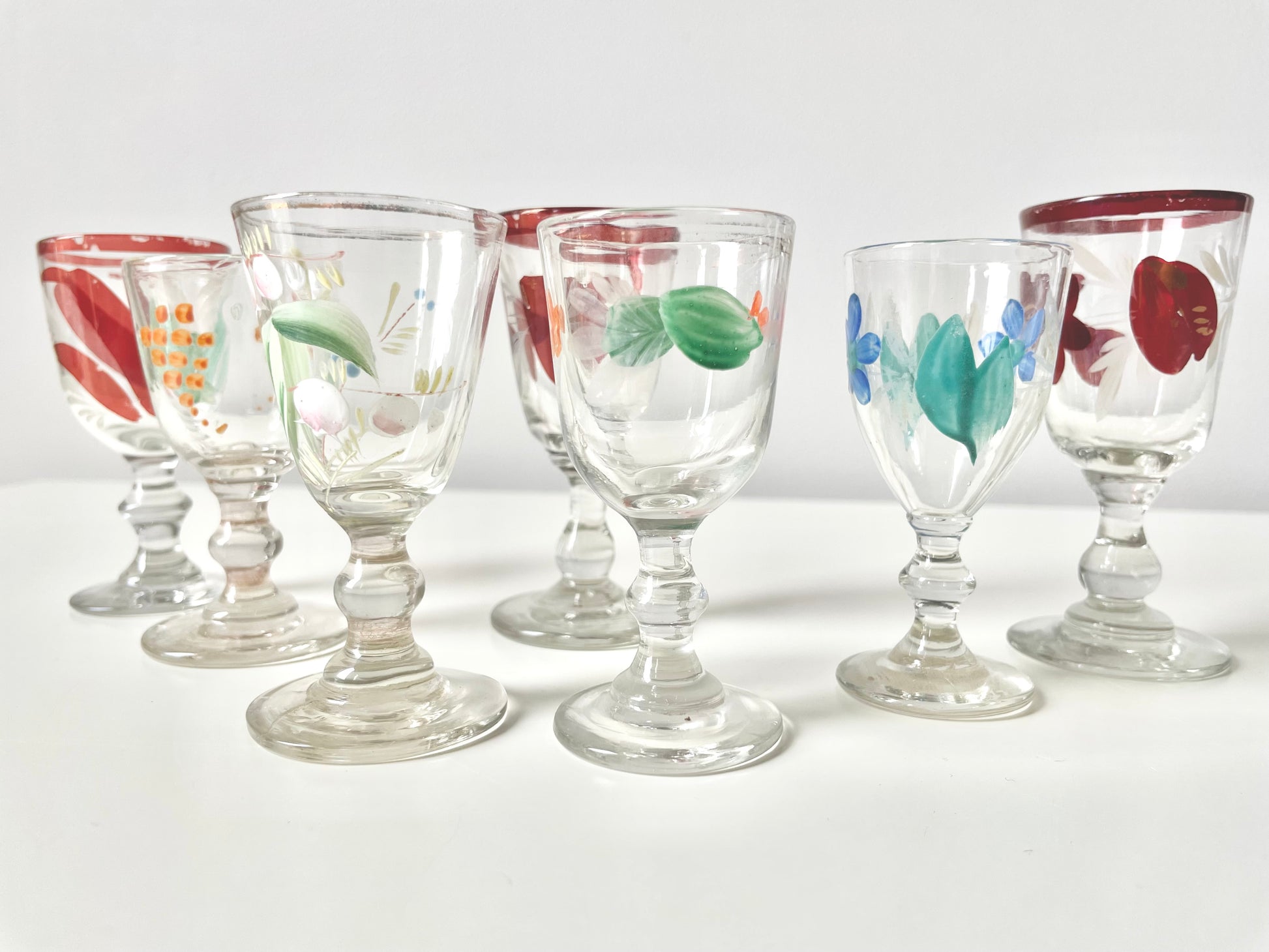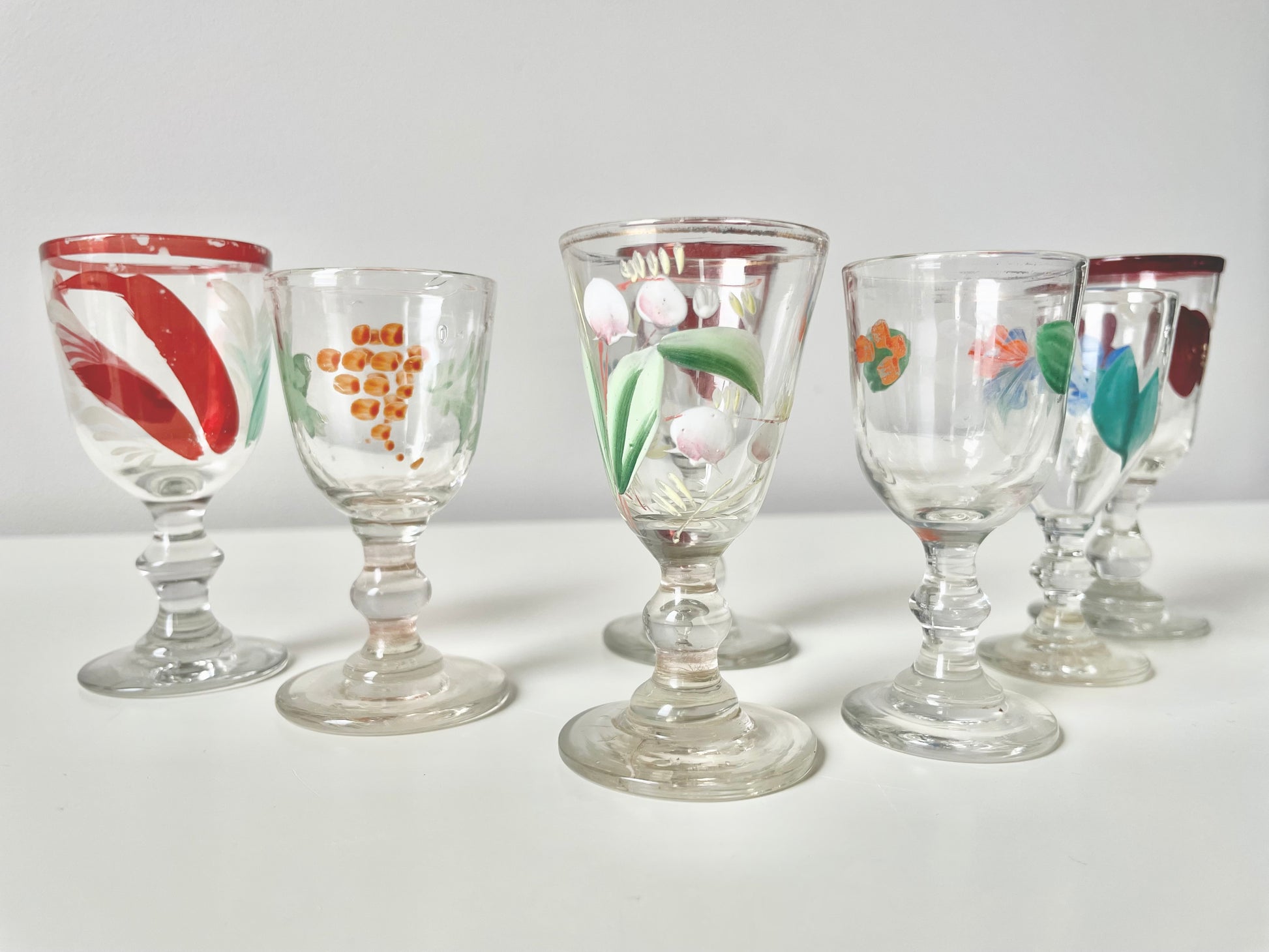 Size and shapes vary slightly, as much as the handpainting quality of these 100+ years items. Nevertheless, finding 7 shot glasses of similar style is not an easy exercise. Enjoy having the set.
