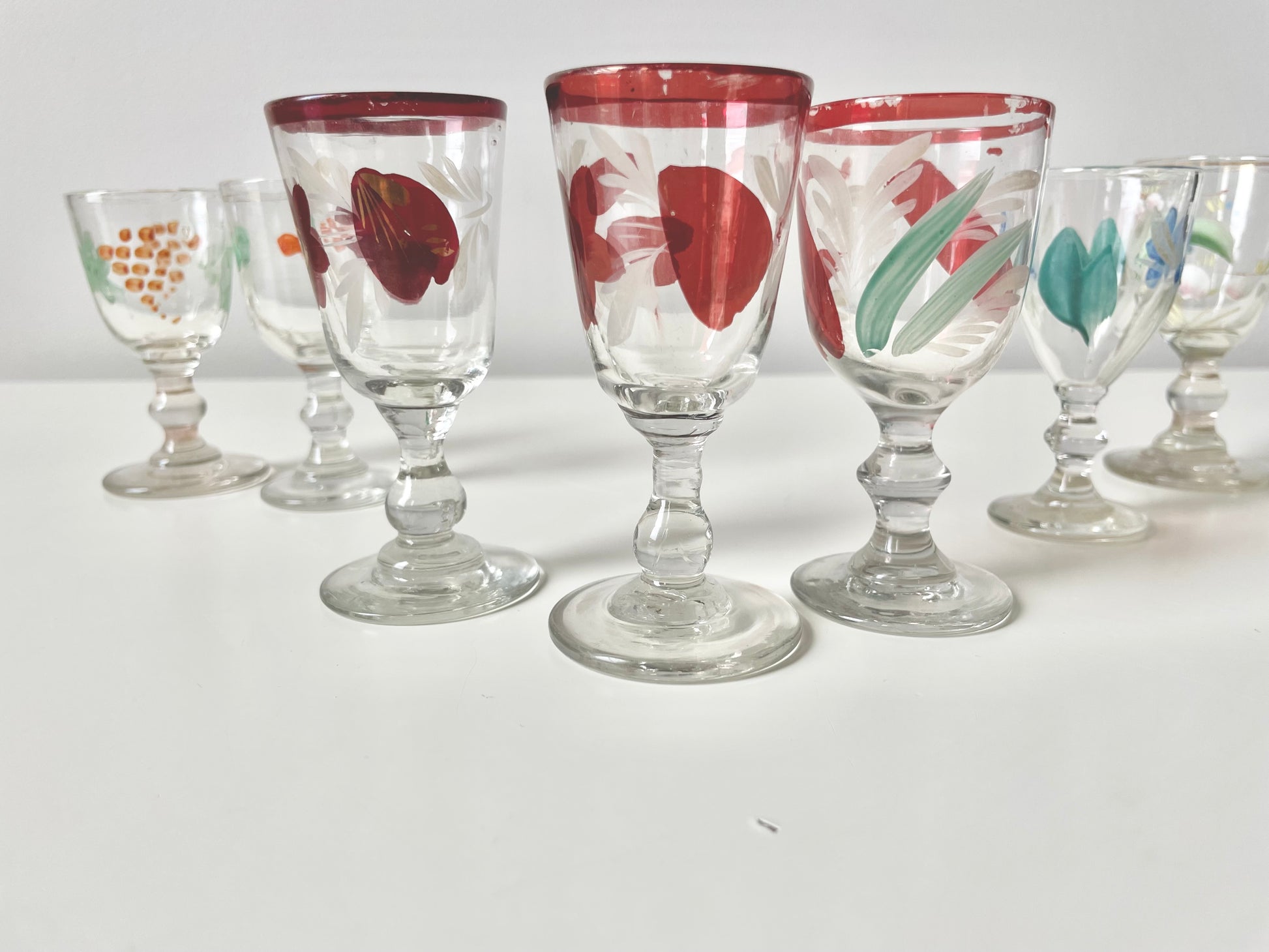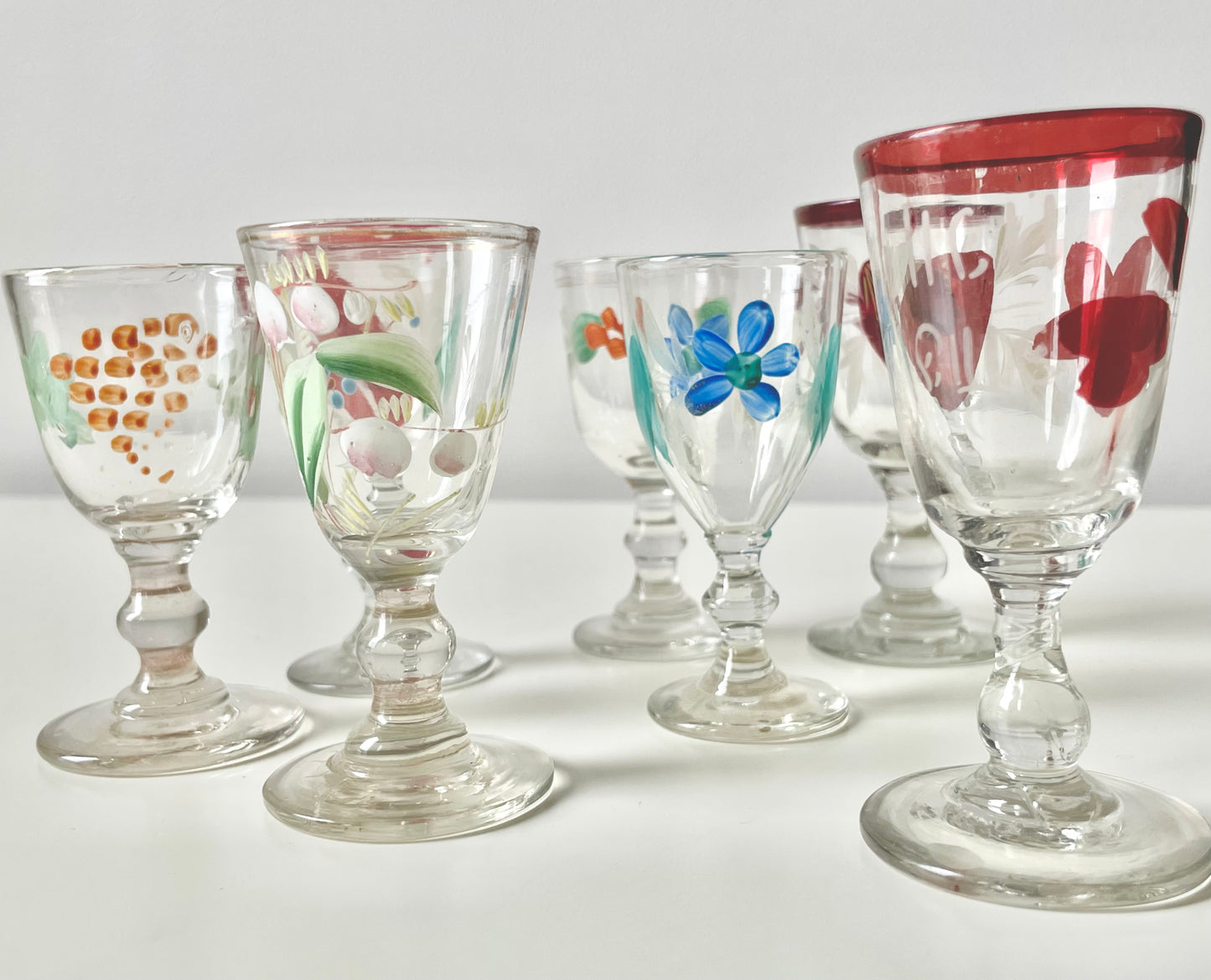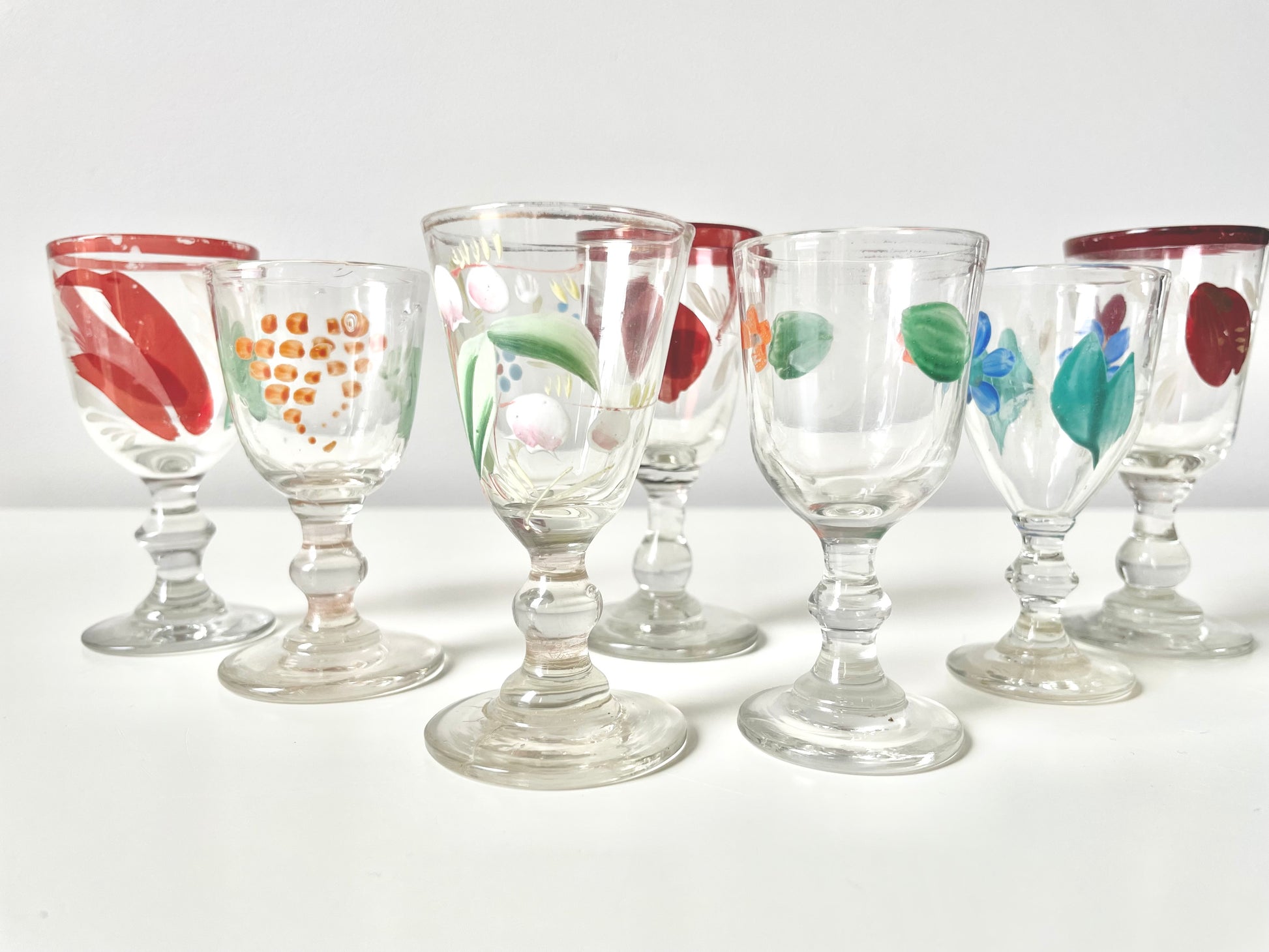 Size and shapes vary slightly, as much as the handpainting quality of these 100+ years items. Nevertheless, finding 7 shot glasses of similar style is not an easy exercise. Enjoy having the set.