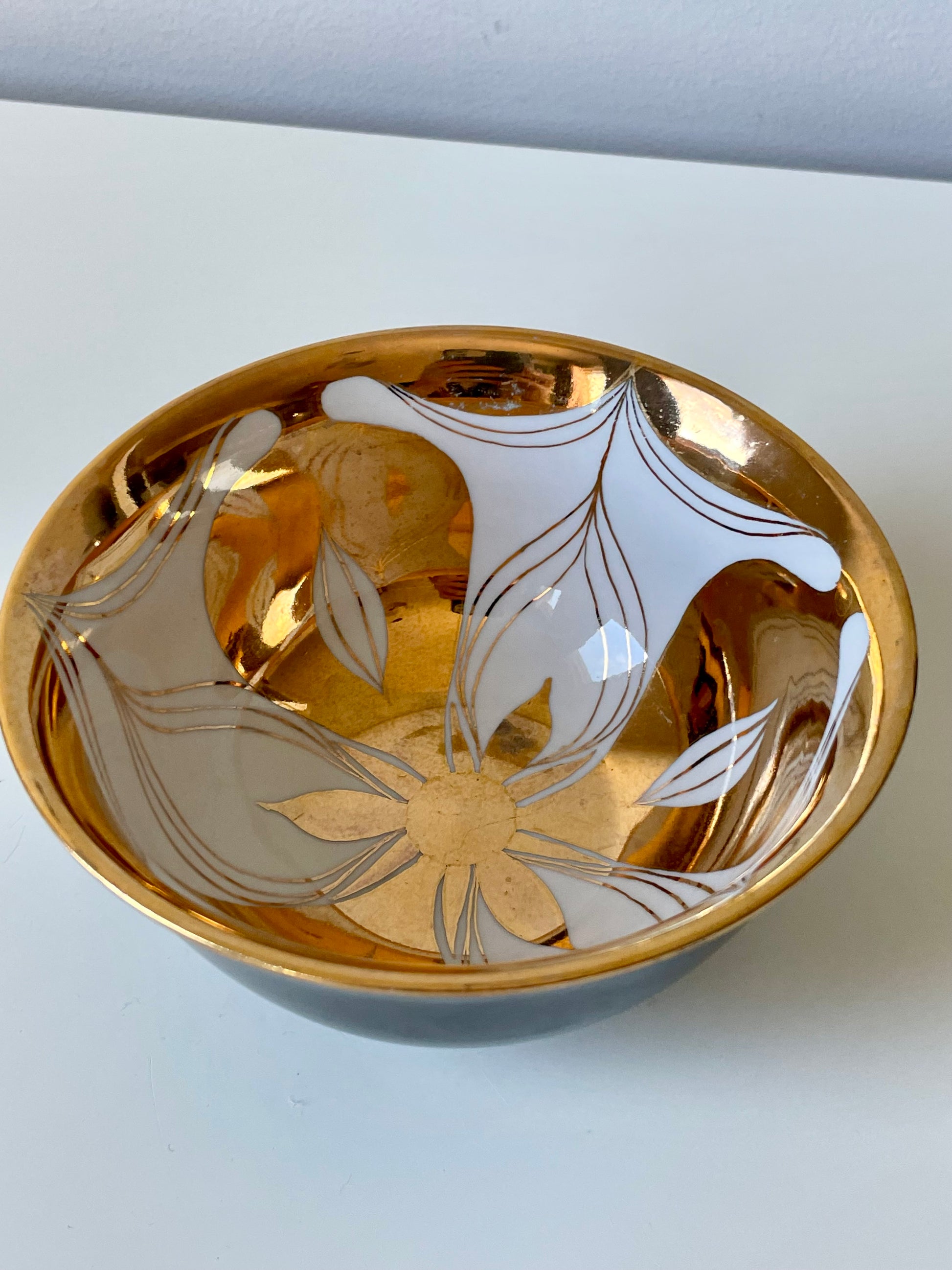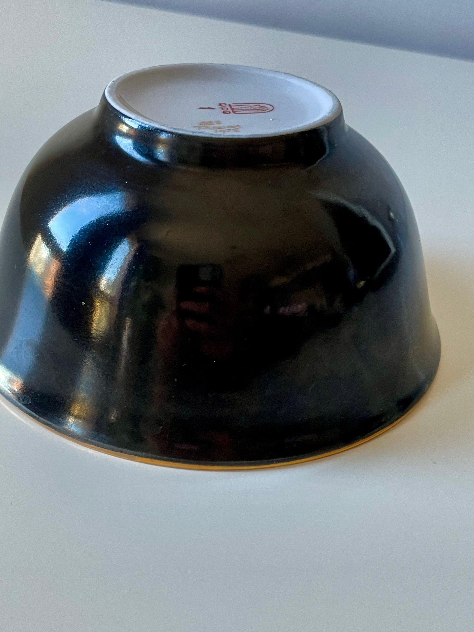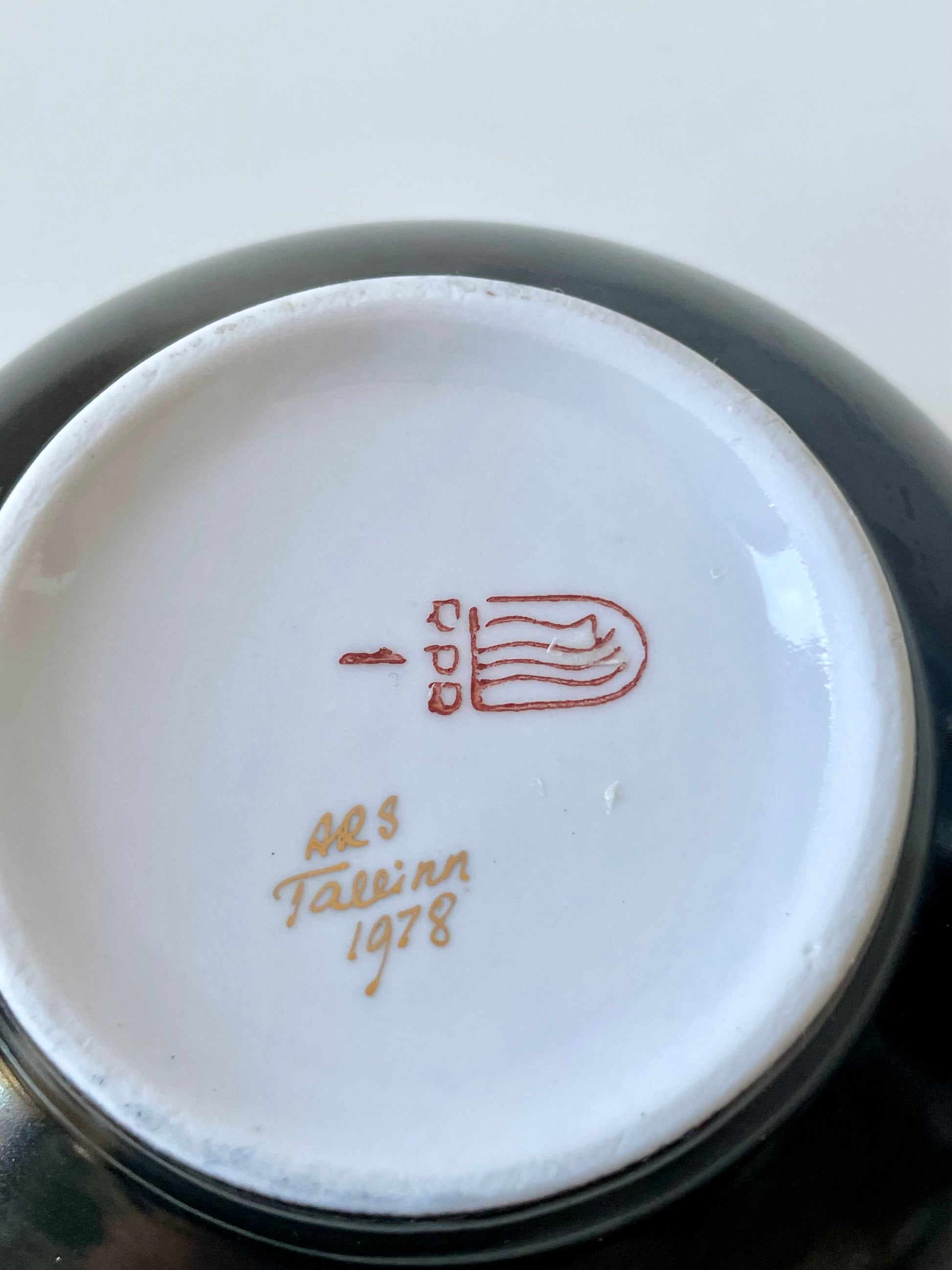 Hand-painted (gilded) Riga Porcelain Factory’s bowl. Hallmark refers to the production period 1978. Item is marked as the first (=highest) quality grade, therefore the hallmark is red.