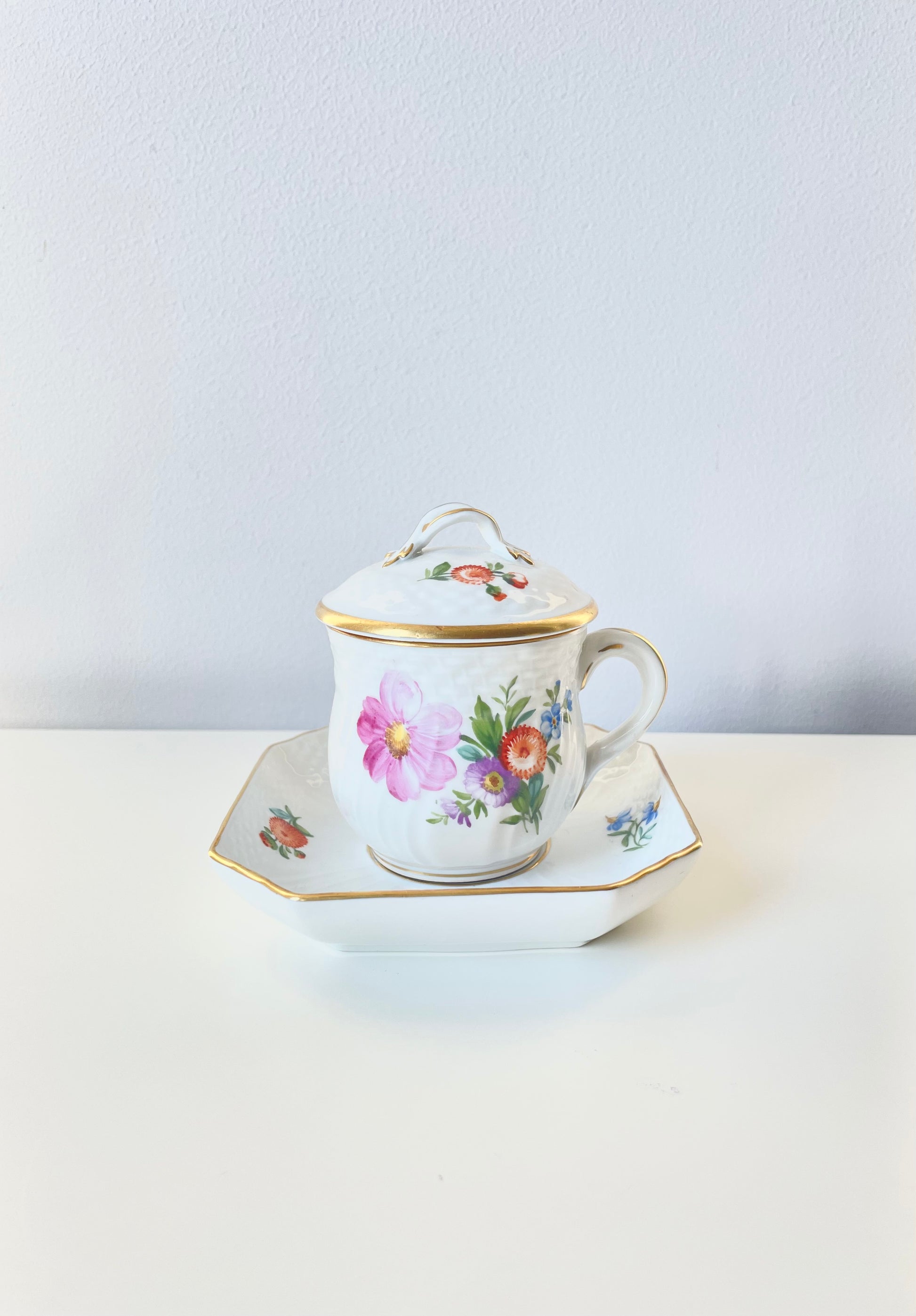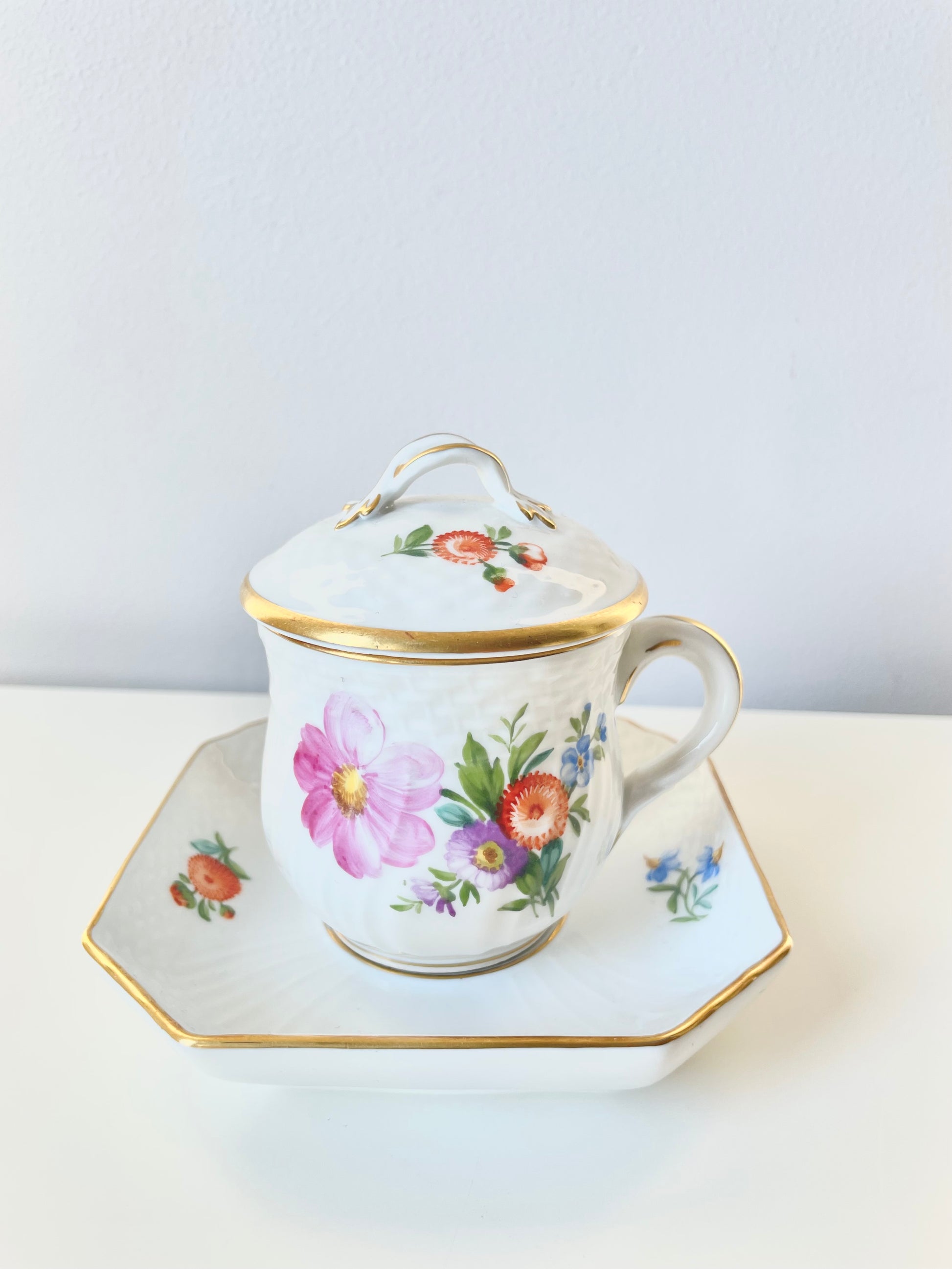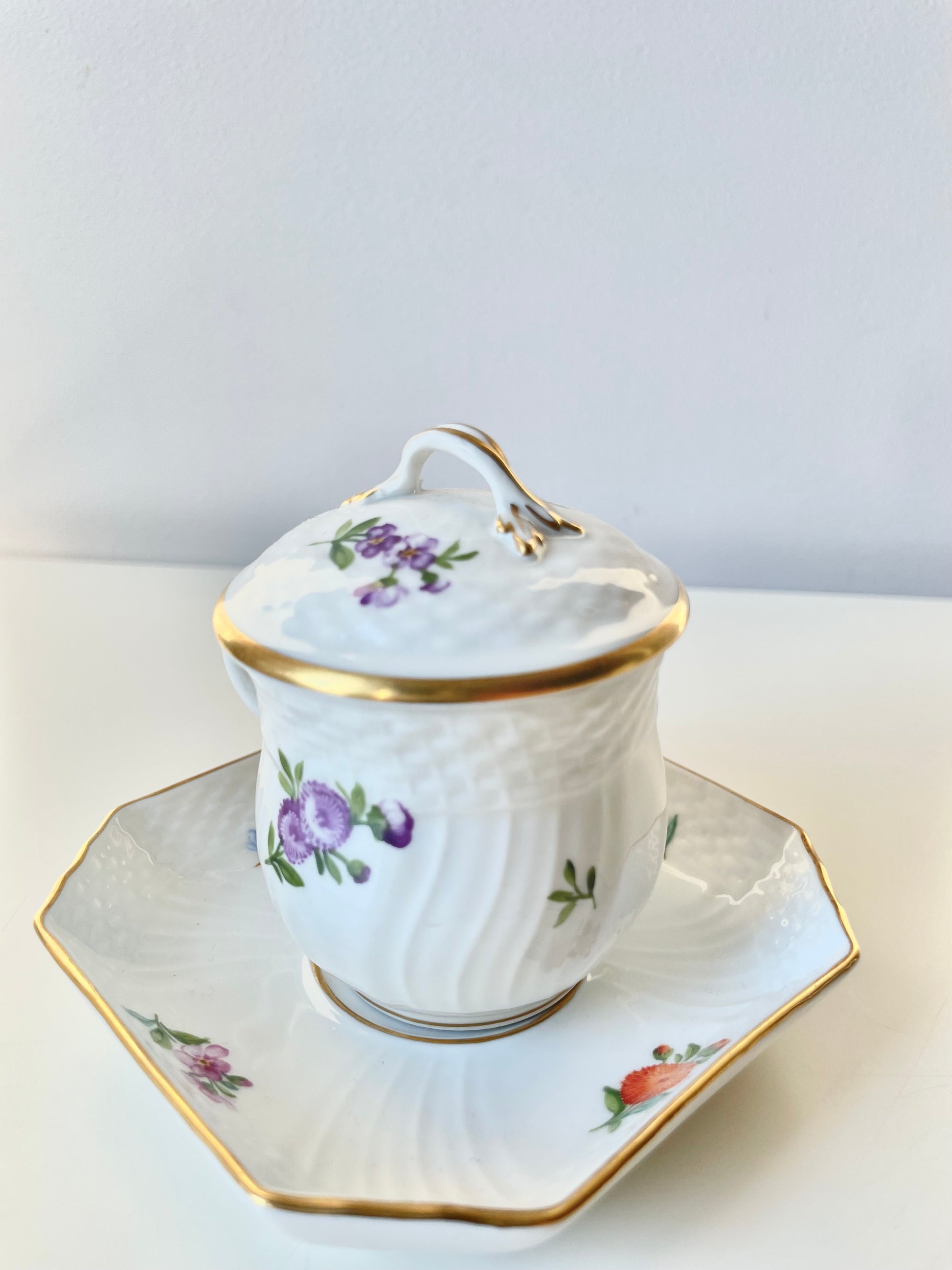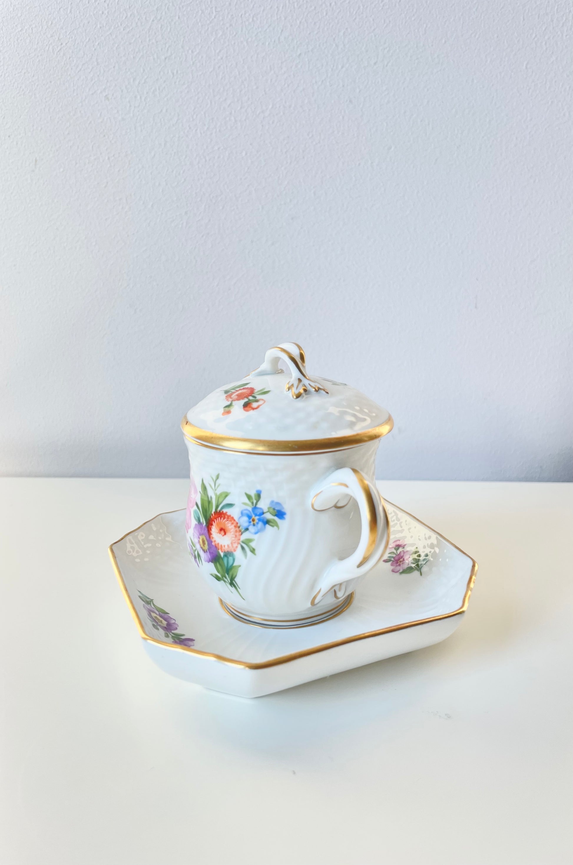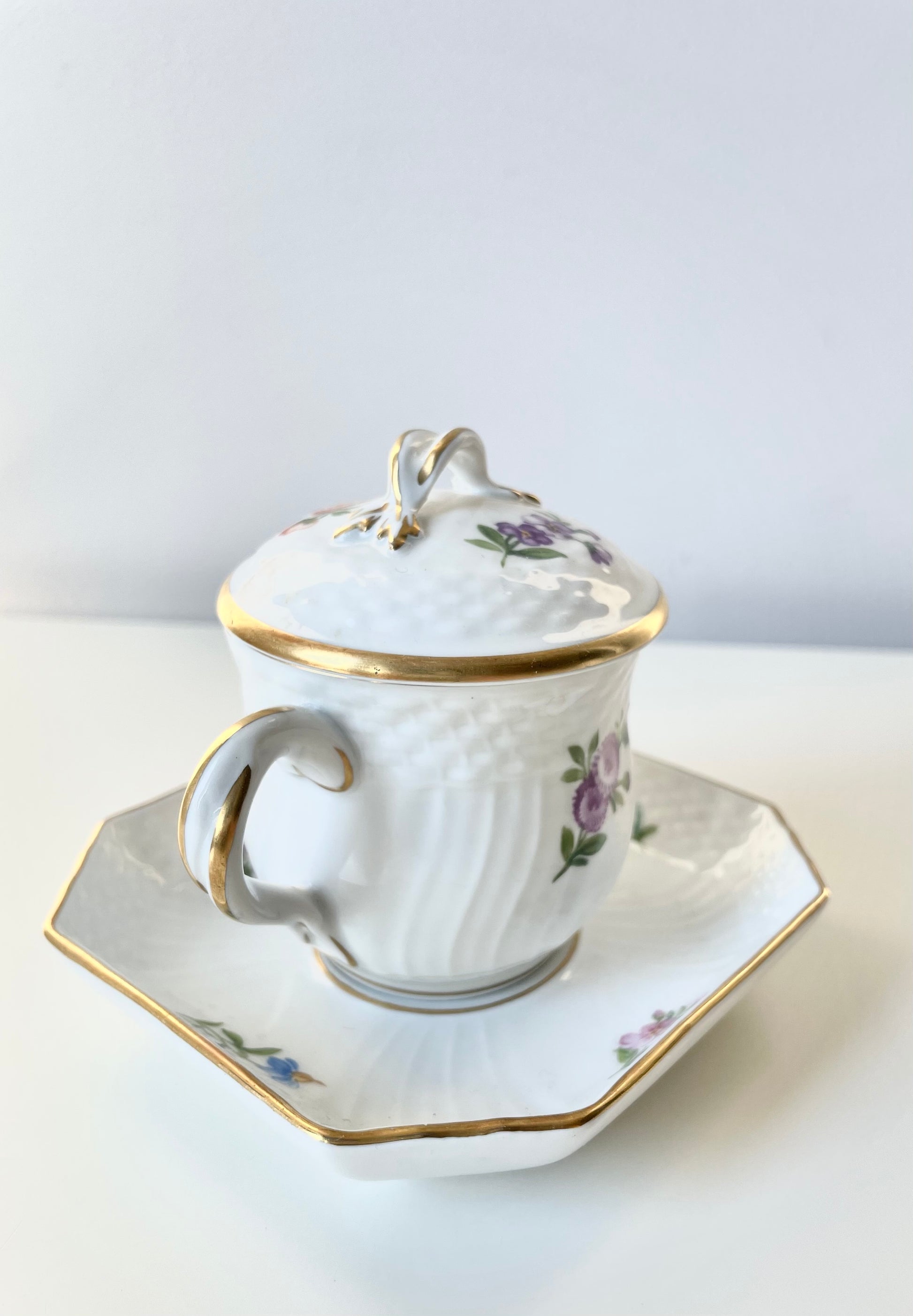 This Saxon Flower porcelain braided chocolate cup with lid and saucer is a rear find produced around 1950-ies.