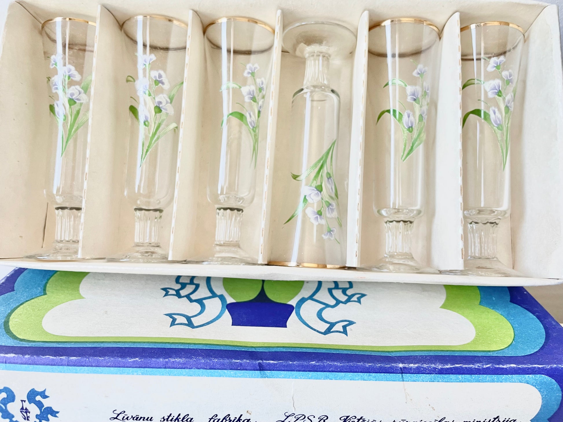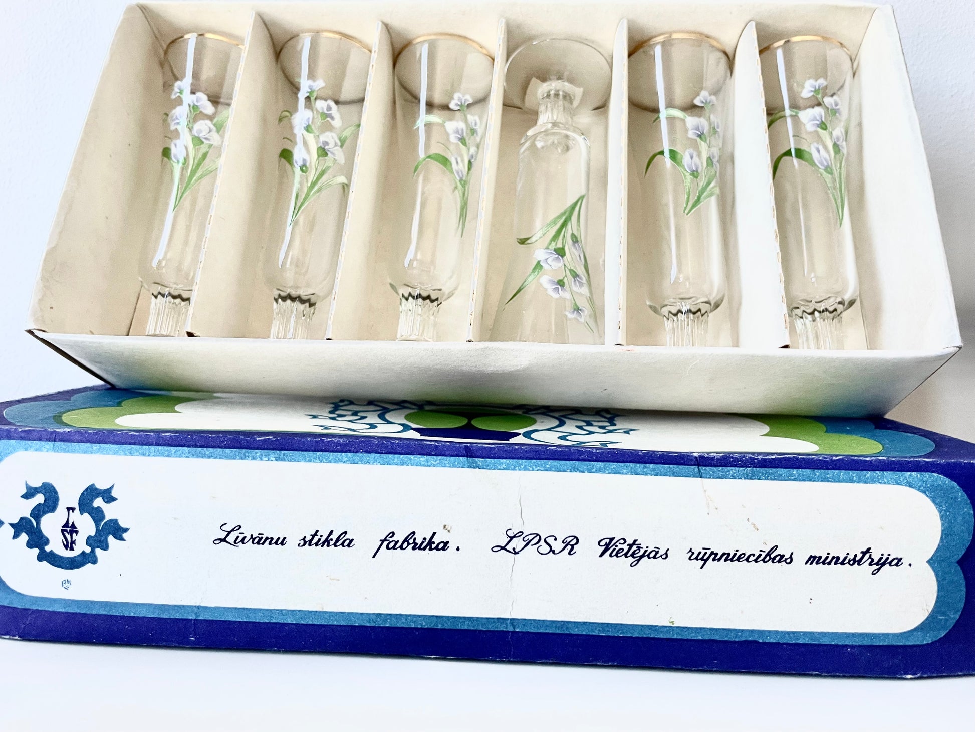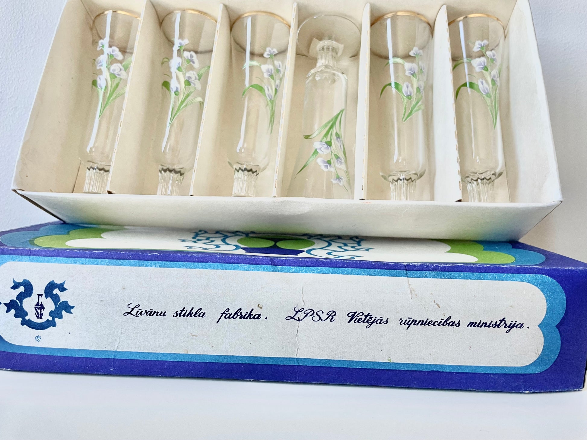 Latvian vintage shot glasses in the original box. Produced by the Livani Glass Factory.