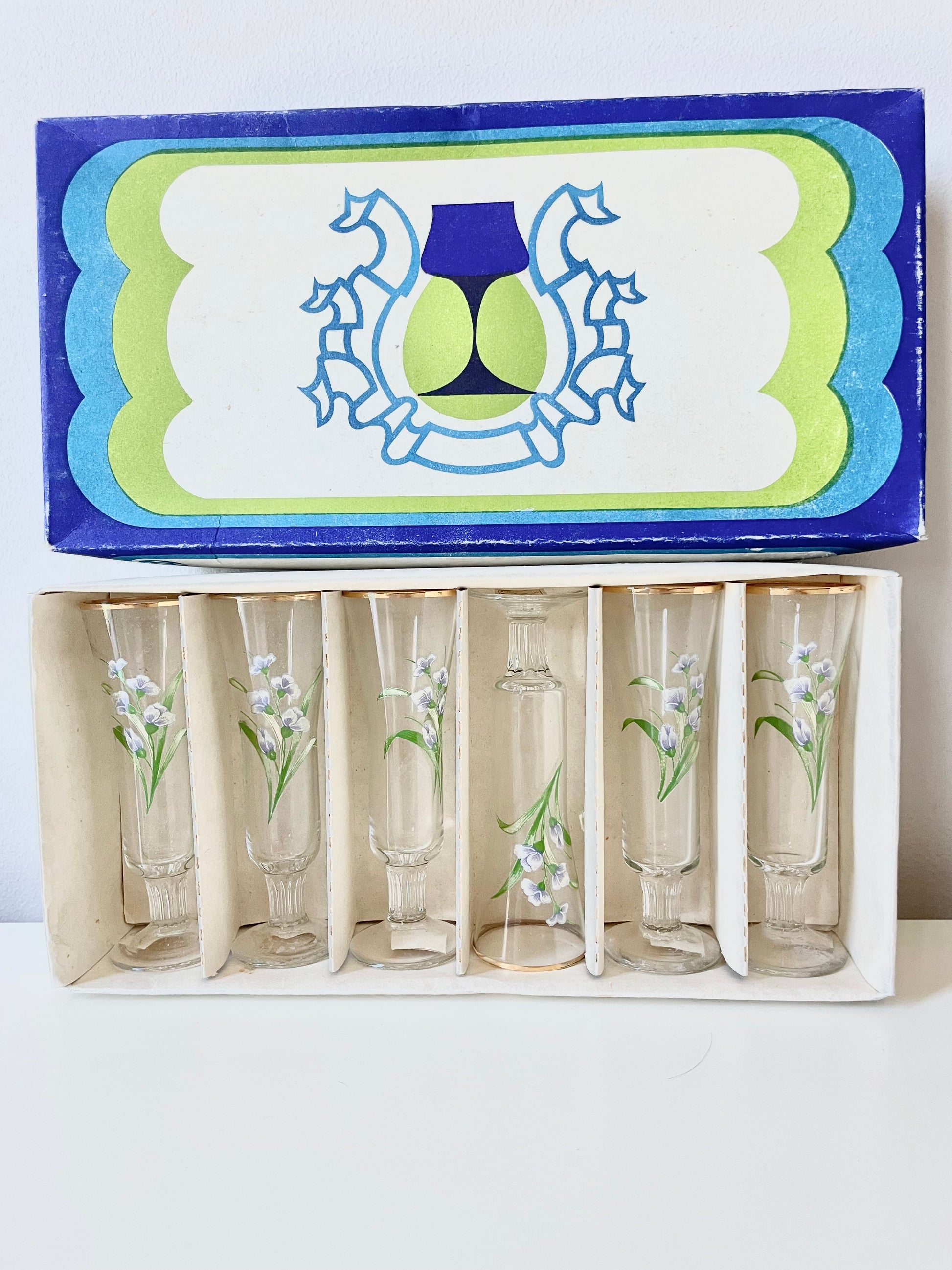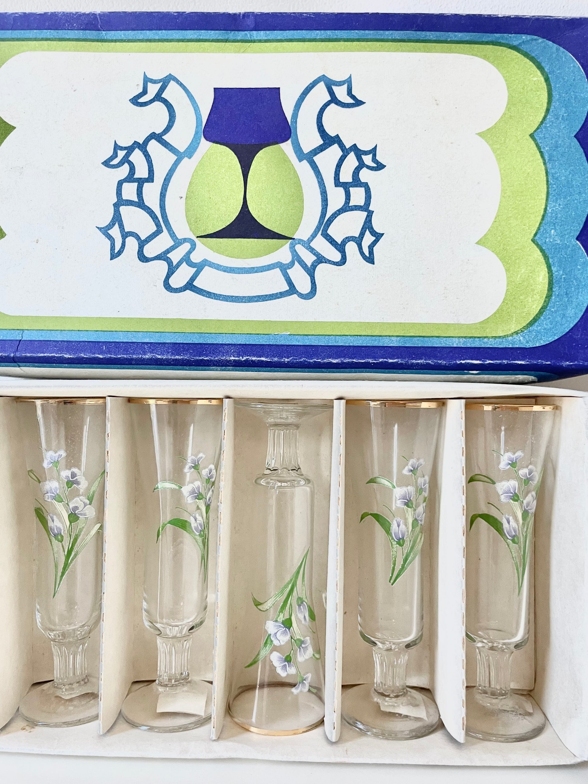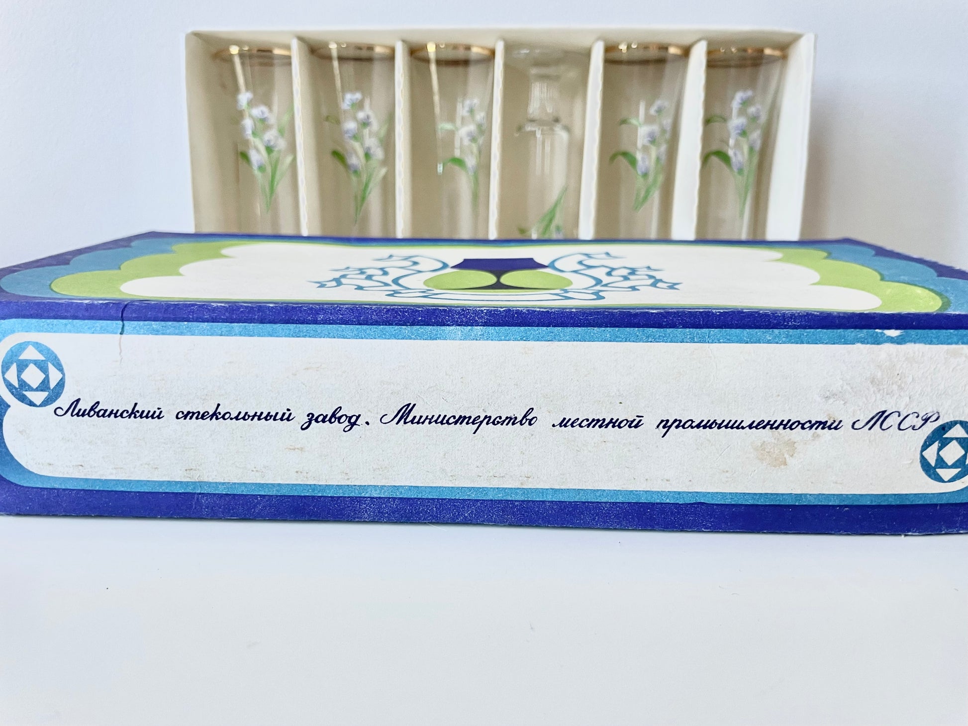 Latvian vintage shot glasses in the original box. Produced by the Livani Glass Factory.